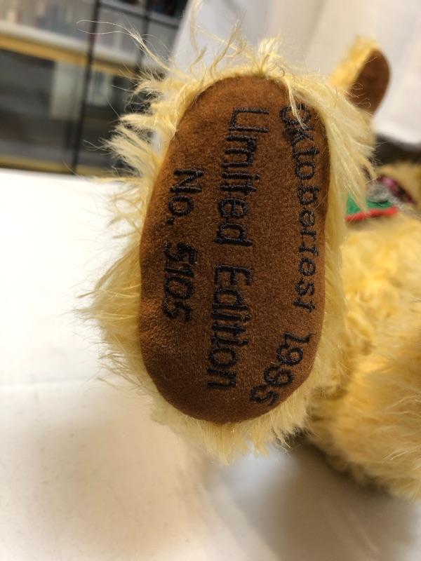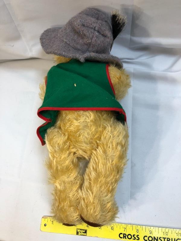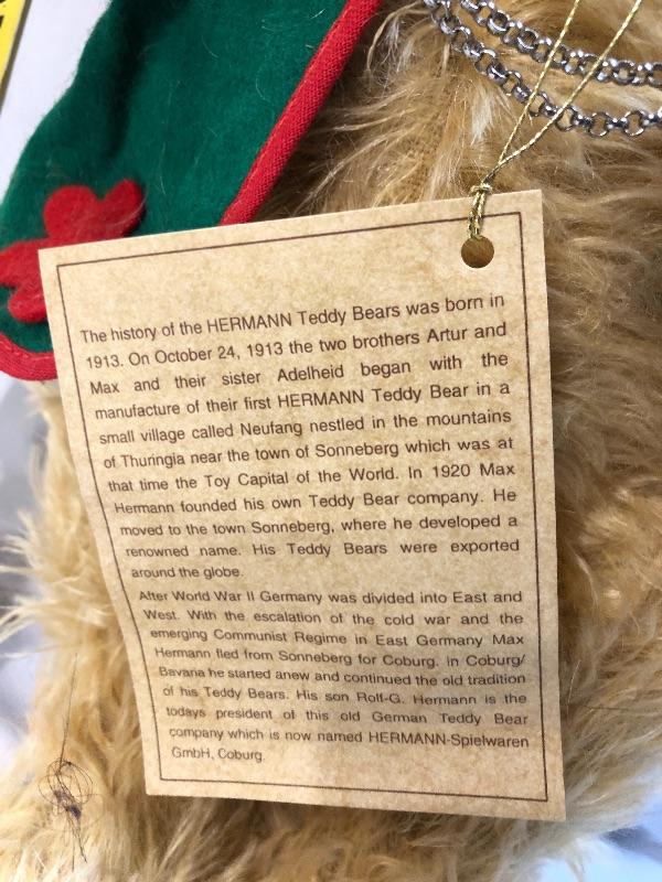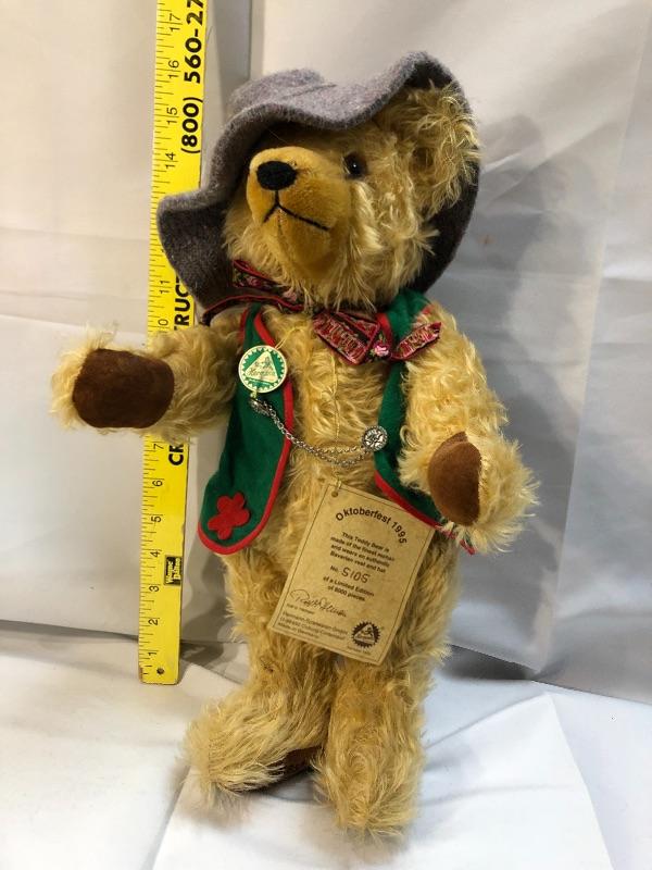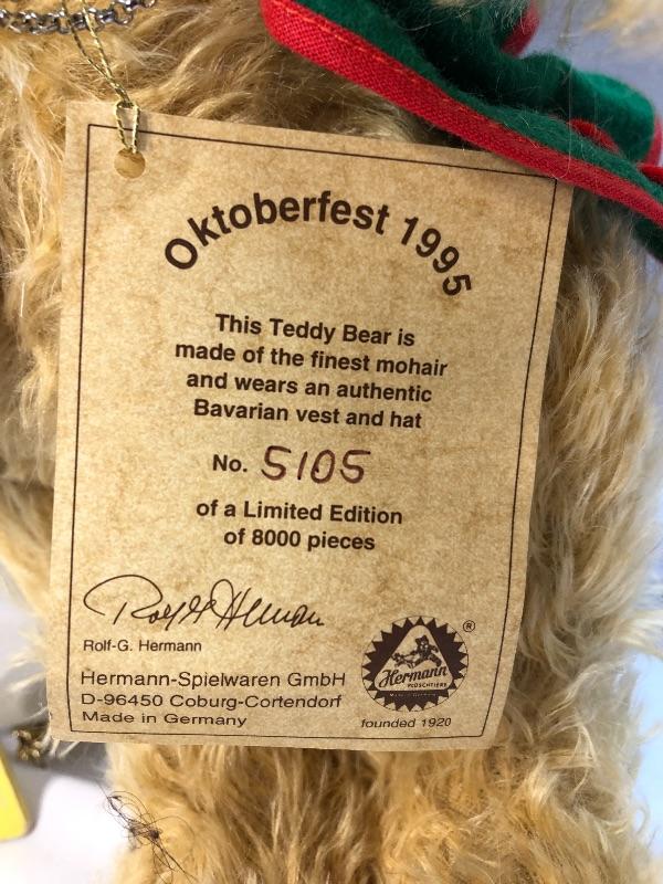 1995 Hermann Co Oktoberfest teddy bear. Limited edition, #5105 or 8000. Has an authentic Bavarian vest and hat on. Jointed limbs. Foot is stitched with info also. 16" size.