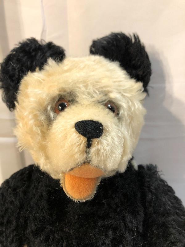Vintage panda bear plush. Black and white jointed limb bear. Open mouth, brown eyes. No tags. About 15" size.