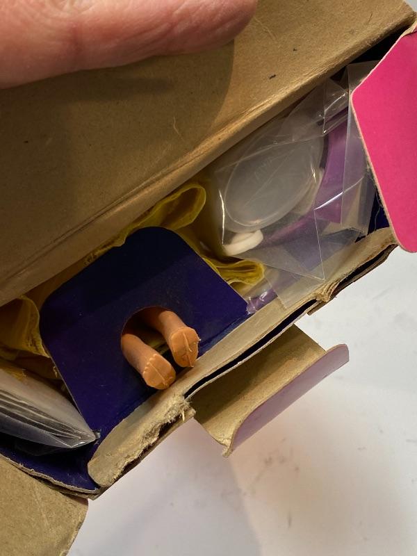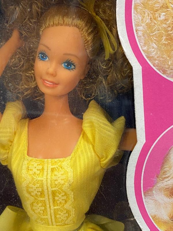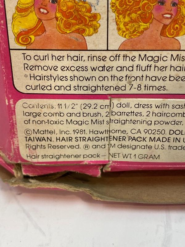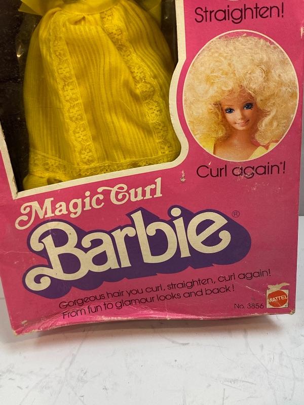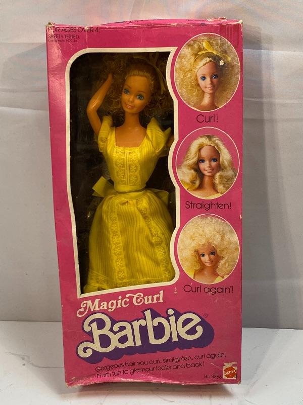 New in Box. Mattel's 1981 MAGIC CURL BARBIE. Doll #3856. Looks complete, accessories were never removed. I did not notice her shoes anywhere. She is still stuck to cardboard liner. Bright yellow dress, bent arms. Box has damage from years of storage.