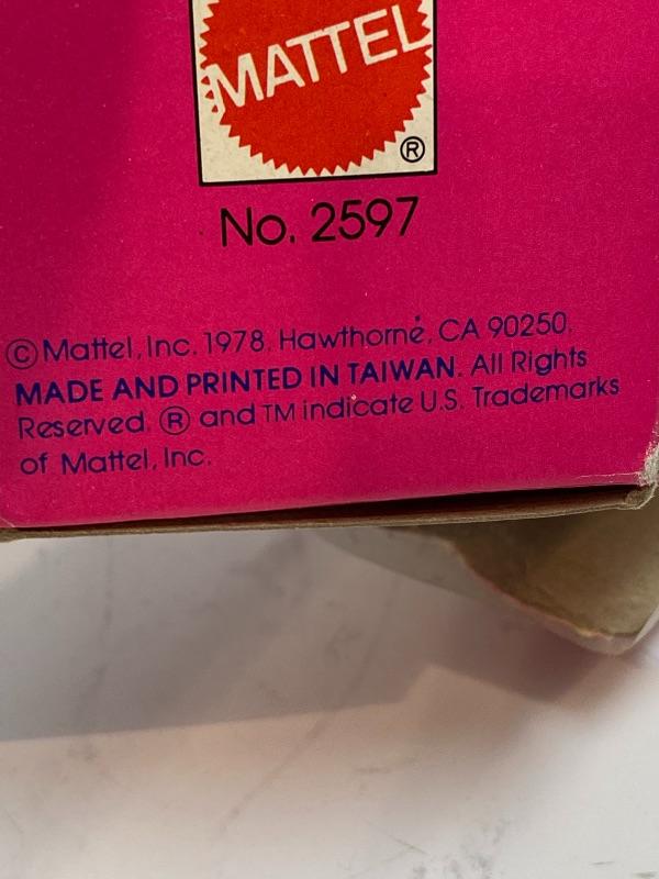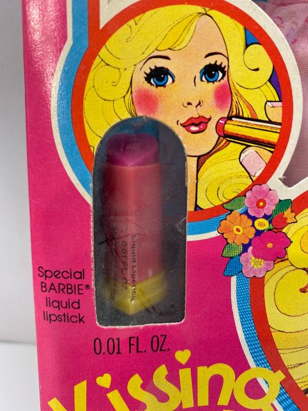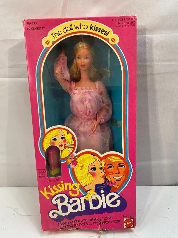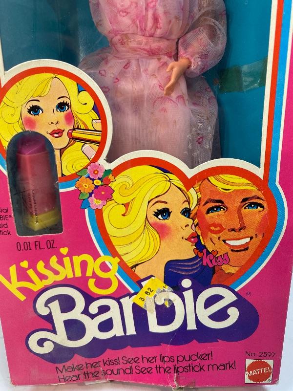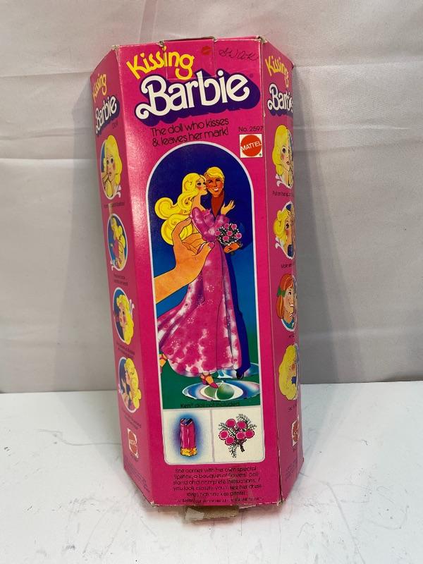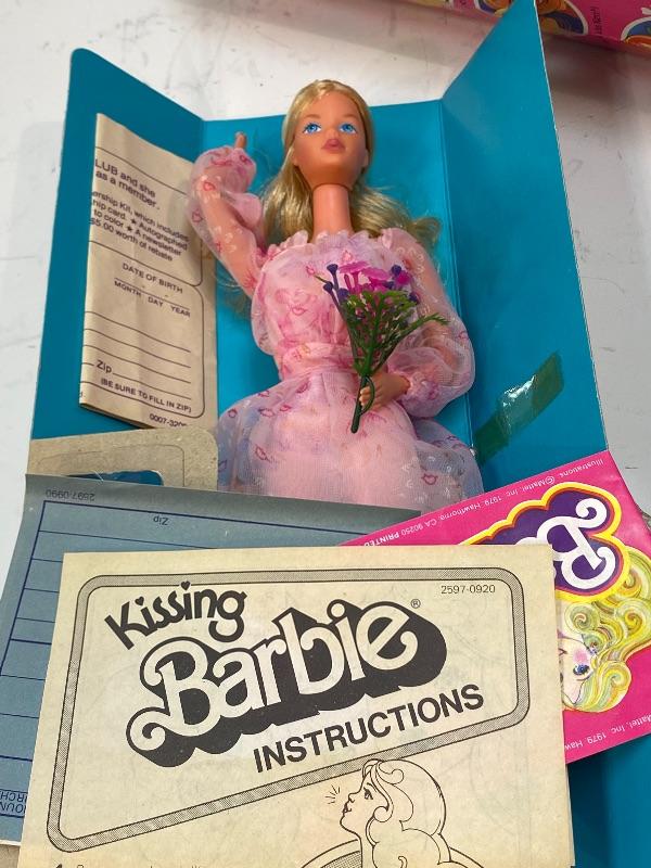 Vintage 1978 Mattel KISSING BARBIE doll NEW IN BOX. Doll and accessories are still attached to liner cardbaord. Box has some light wear damage from storage.