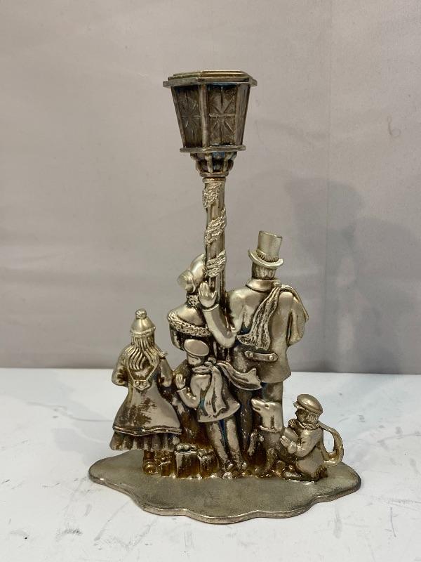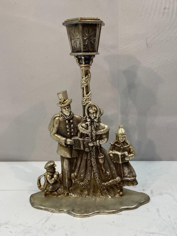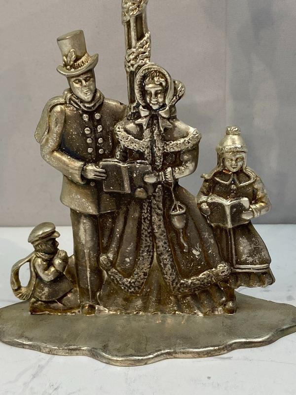 Christmas holiday carolers candlestick holder. Pewter or possible silverplate. Stands about 7".