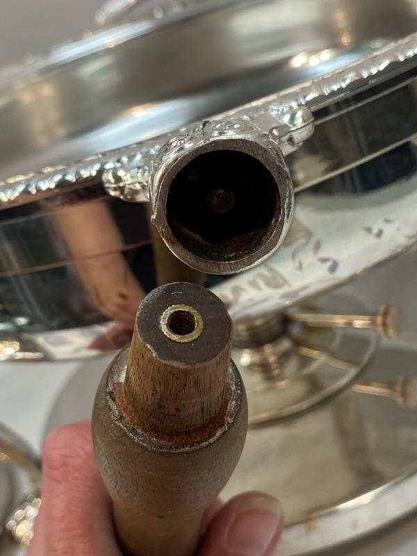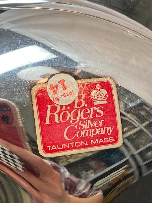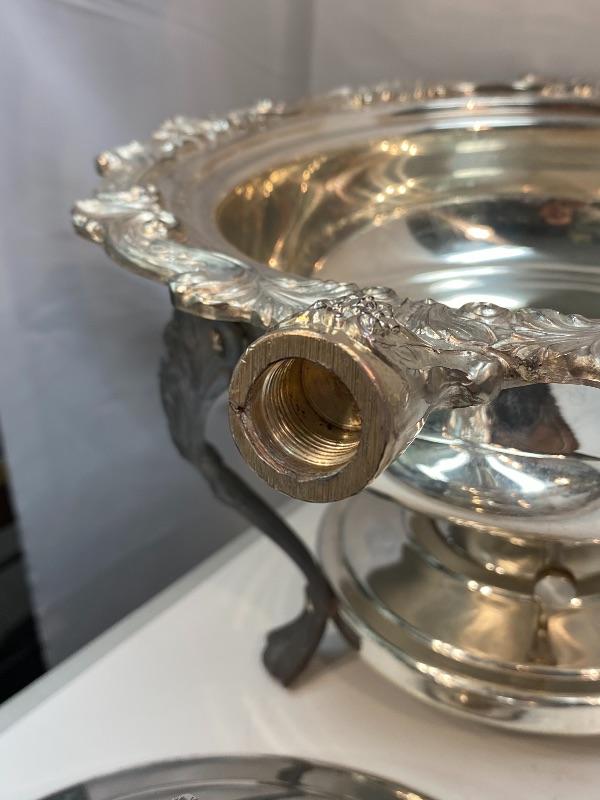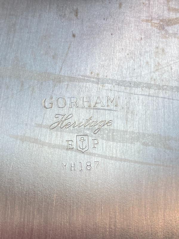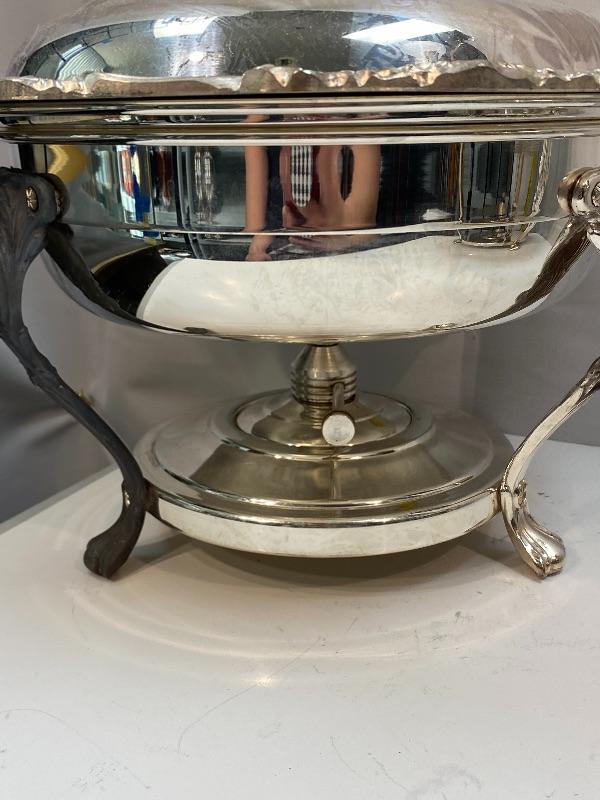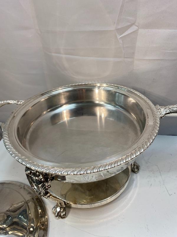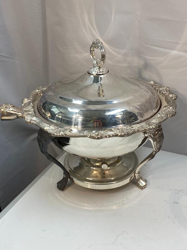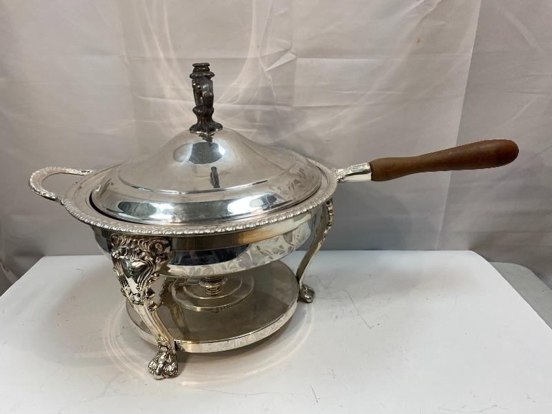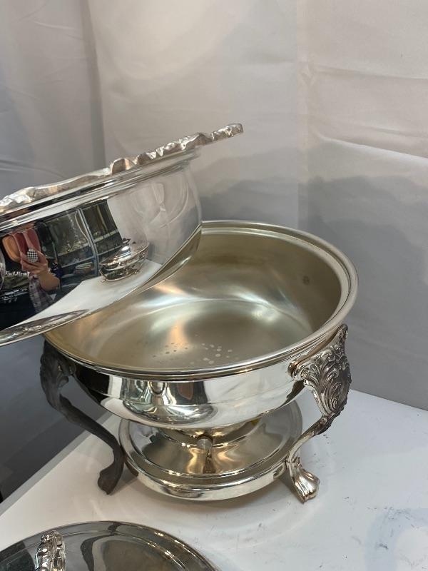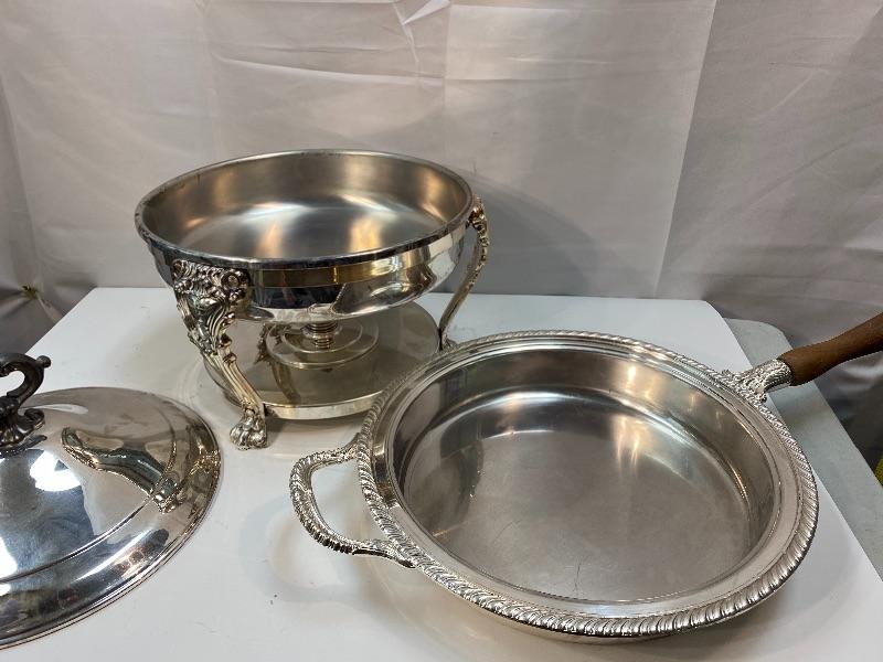 Mixed 5 piece set of silver plate serving pieces. Great for your next party or holiday feast. Includes a roast platter, oblong lidded casserole, gravy boat with warmer stand, two lidded casserole dishes with warmers. The lidded casseroles with warmers have clear Pyrex bowls inside, both should have a single wood handle, but one is missing. Makers include Gorham and Rogers, all are silver plate. In excellent vintage condition, except for the missing handle.