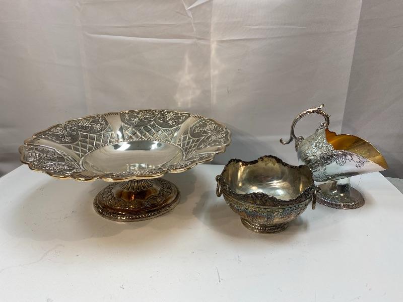 3 piece lot of silver plate serving pieces. Ornate heavy pieces, great for display. Tarnished but no dents or dings.