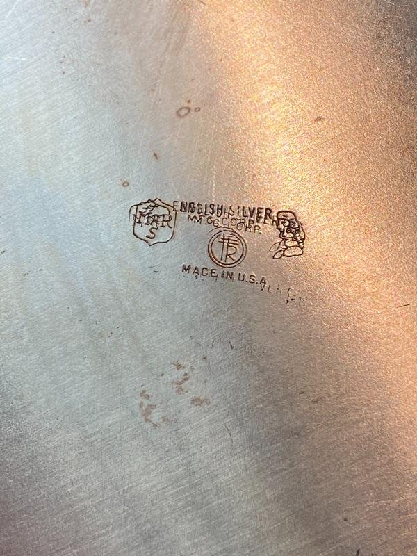 Vintage English Silver lidded casserole dish. Silver plate, has clear glass Pyrex bowl inside. No dings or dents just tarnished. 12" across.