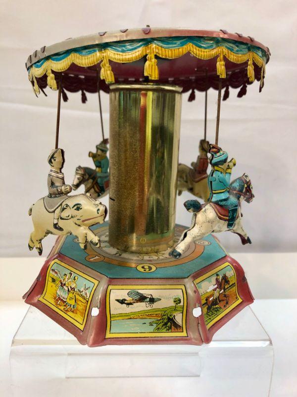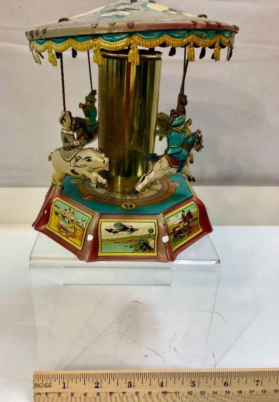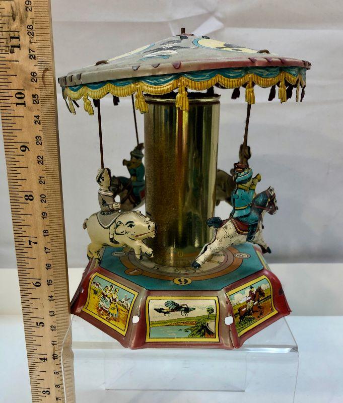 Measures approx. 6" H, 5.5" Diameter bottom. Tin Carousel Merry Go Round Toy. Great graphics. Two ponies and two pigs with riders, two circus animals (monkey and elephant) and an equestrian rider, walking geese, Boy running from Lion, Clown with dog, three Dutch Girls, Airplane flying, and Antique car with driver. On top of the base are numbers (not in order). We haven't found a maker's mark, believe it was likely made in Japan. Tin metal is in good condition. Color is good. YD#020-1220-00507