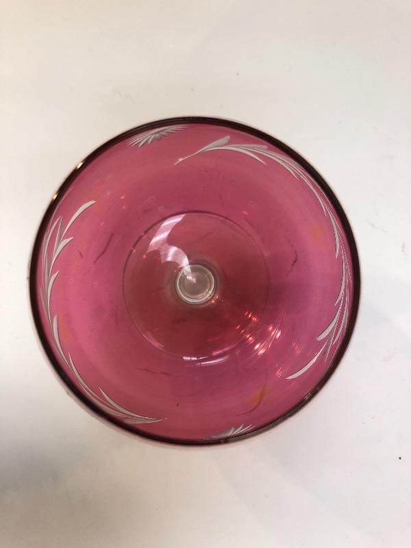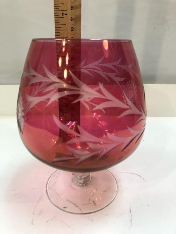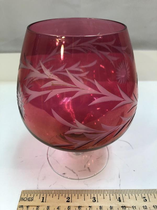 Vintage cranberry glass brandy snifter glass. Cut to a clear floral pattern. Good condition. 6" size.