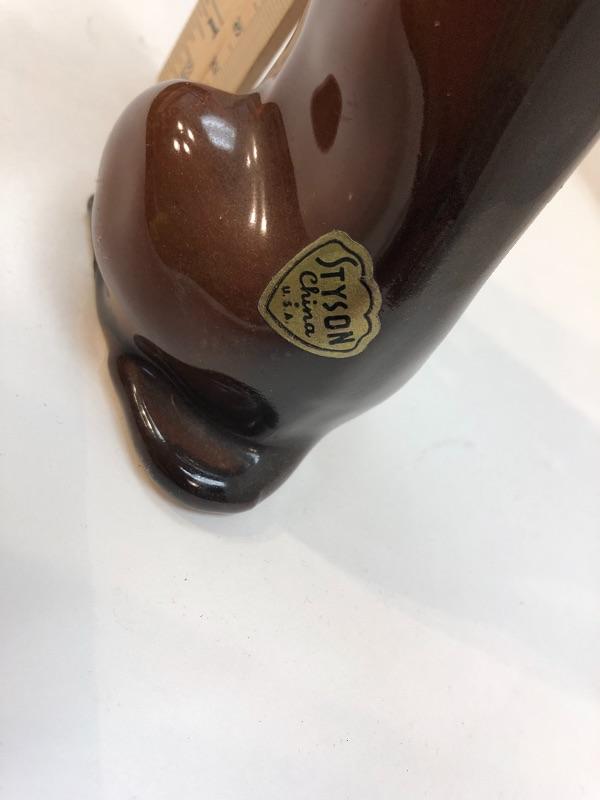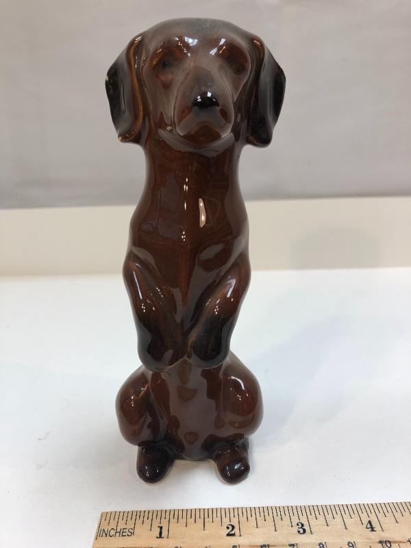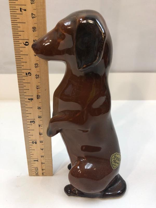 Cute dachshund figurine by Styson China. Dog is sitting up begging. Good vintage condition, still has original sticker tag. About 7" tall.