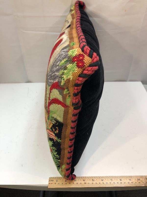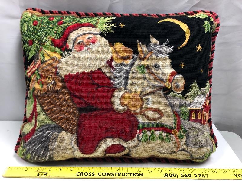 Needle point throw pillow featuring Santa Claus on horseback. Good condition. About 18" on longest edge.