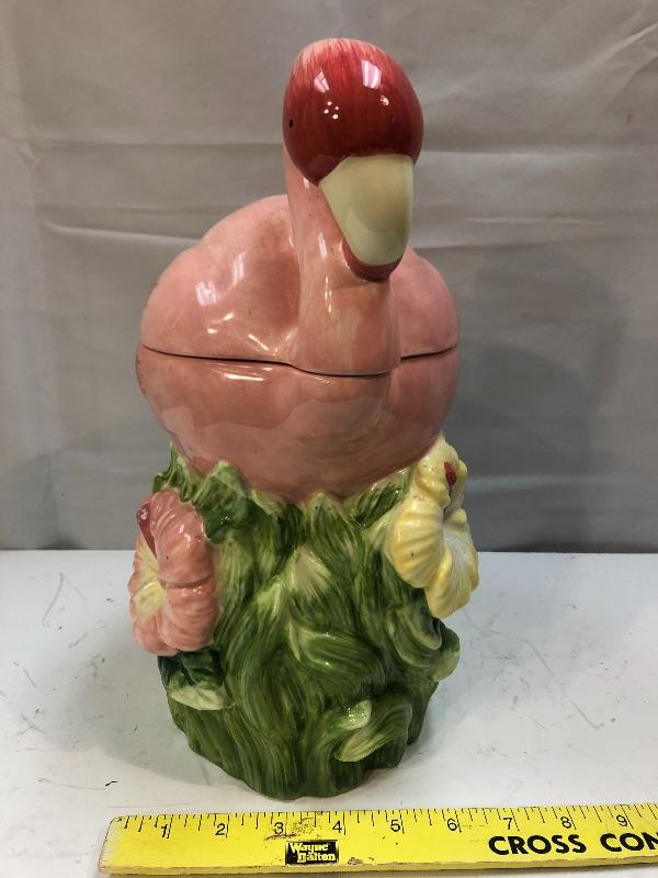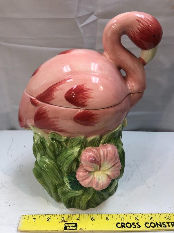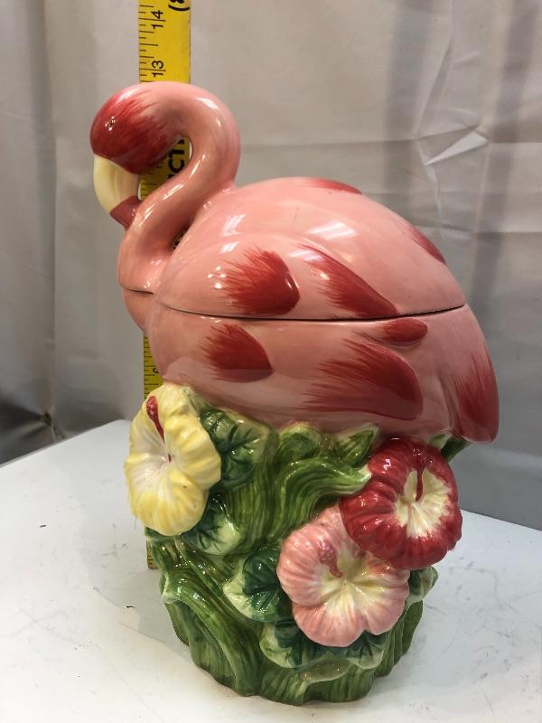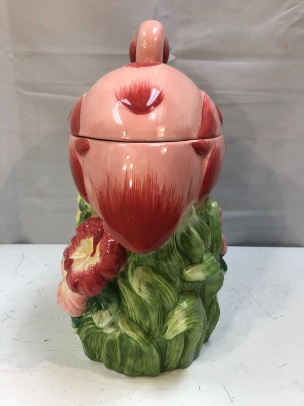 LARGE PINK FLAMINGO HIBISCUS FLOWERS CERAMIC COOKIE JAR TARGET HOME TIKI KITSCH