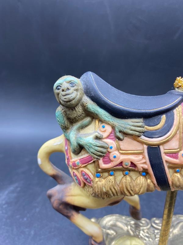 Carousel Camel figurine on brass pole, mounted on a square base. Has small monkey riding on its back.