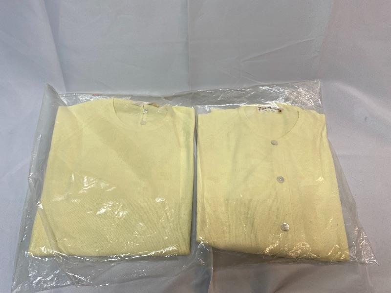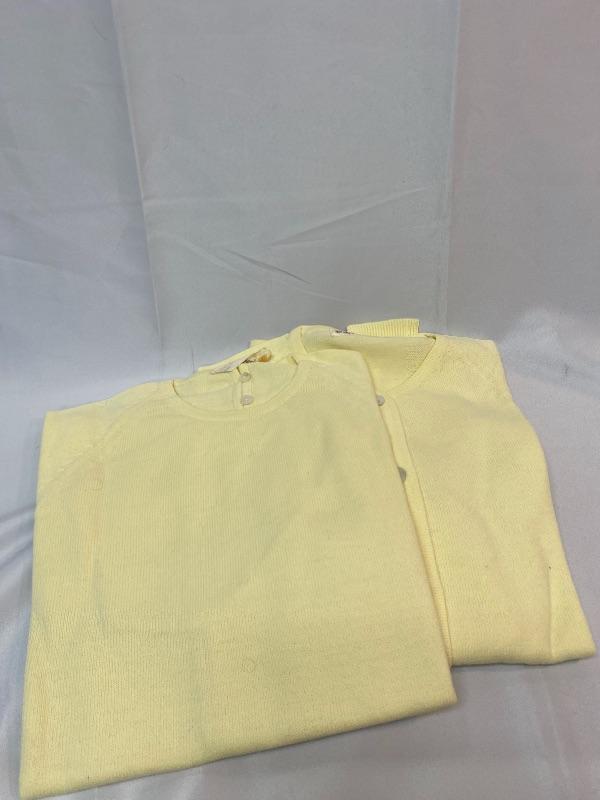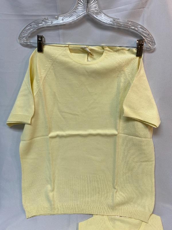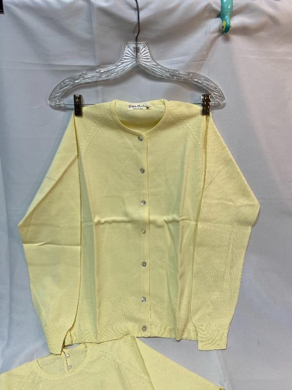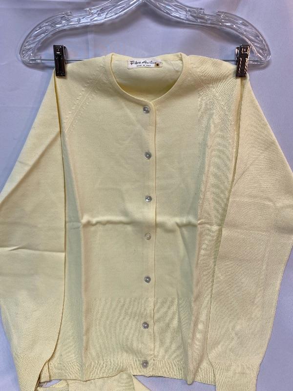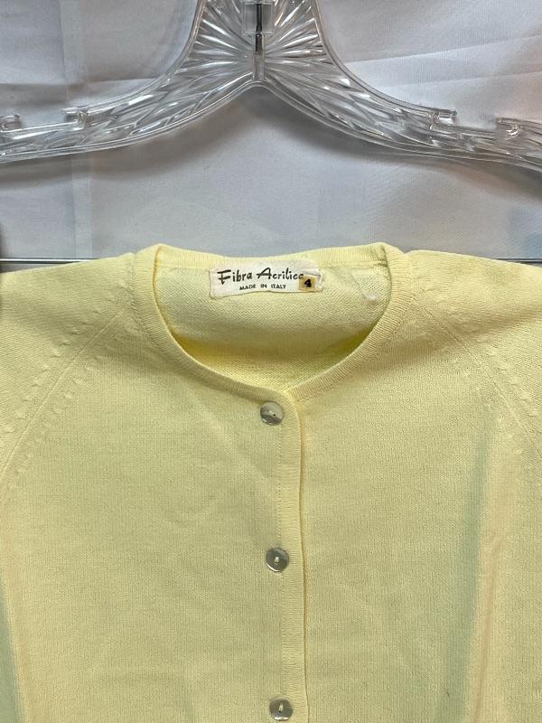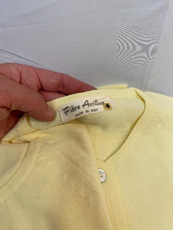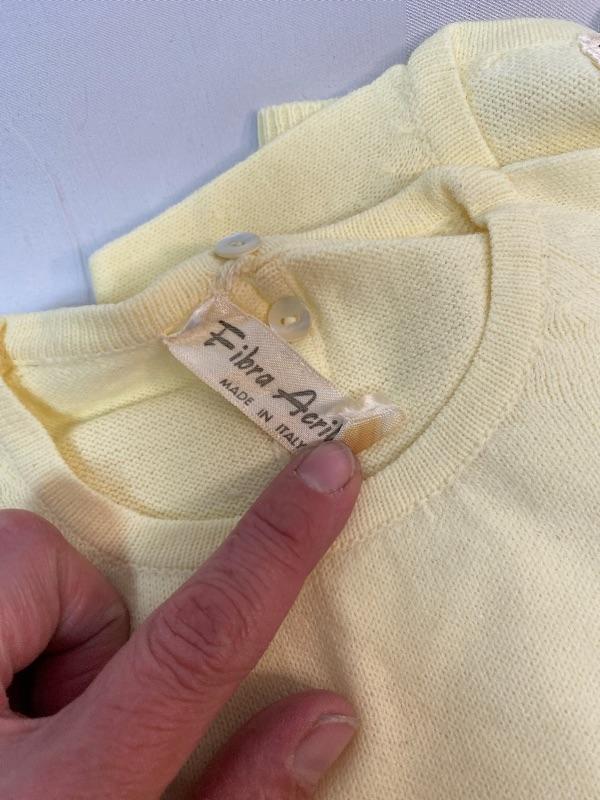 Vintage 2 piece sweater set. Pale lemon yellow. Pull over short sleeve top has two buttons at the back, long sleeve sweater is button front. Made in Italy. Believe they are a vintage large (Italian 46) so may fit like a modern medium. Look like they are possibly unworn.