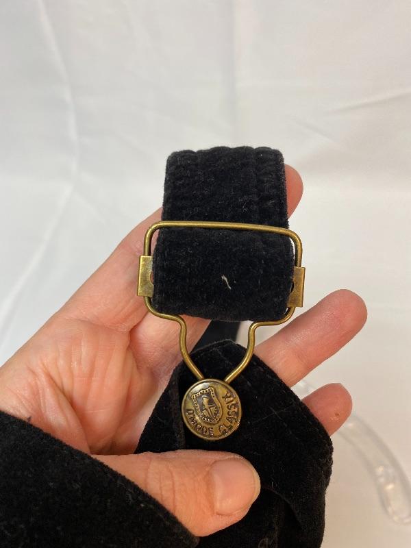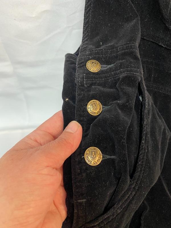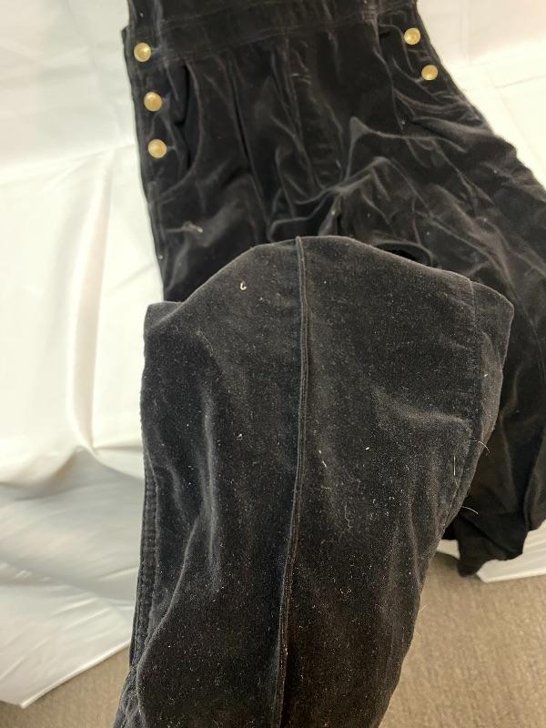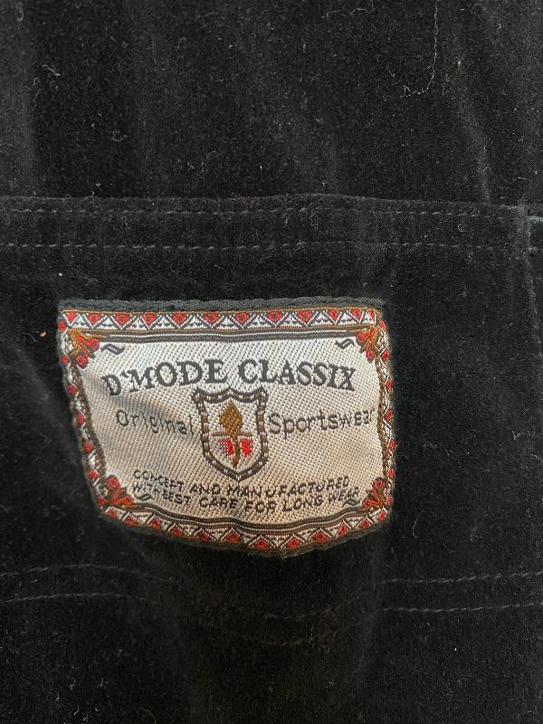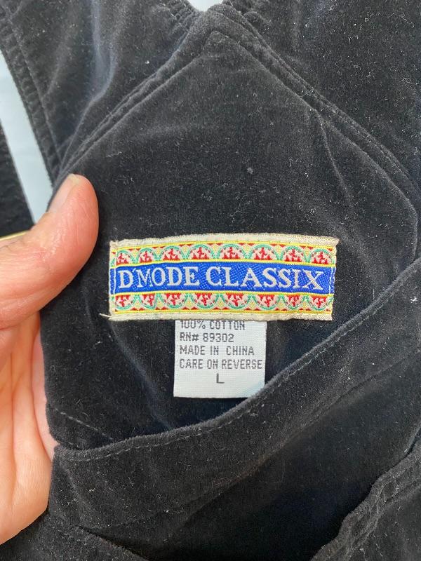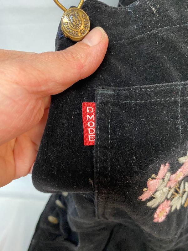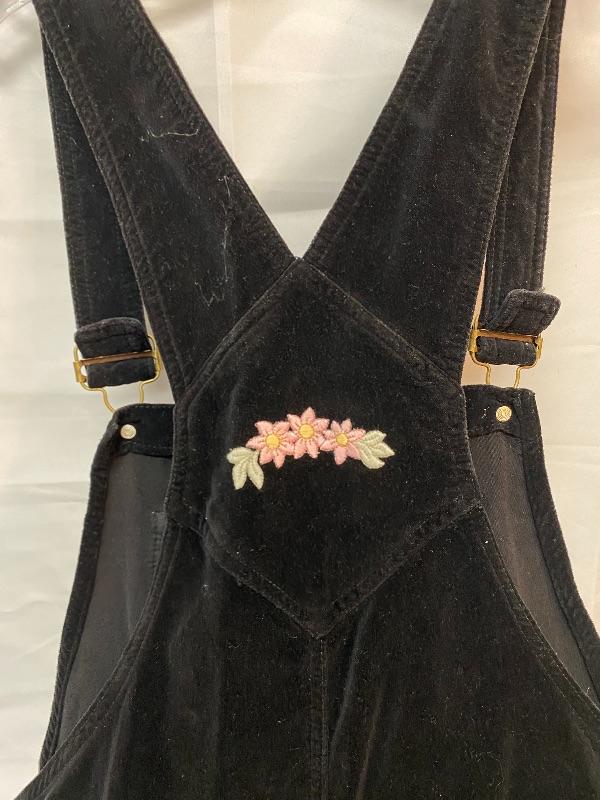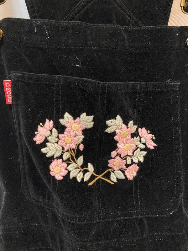 D'Mode Classix black velveteen full length overalls. Adjustable straps. Pink flower embroidery detail on bib and back. Size large. Legs have a thin stitched crease down the front. Good retro condition.