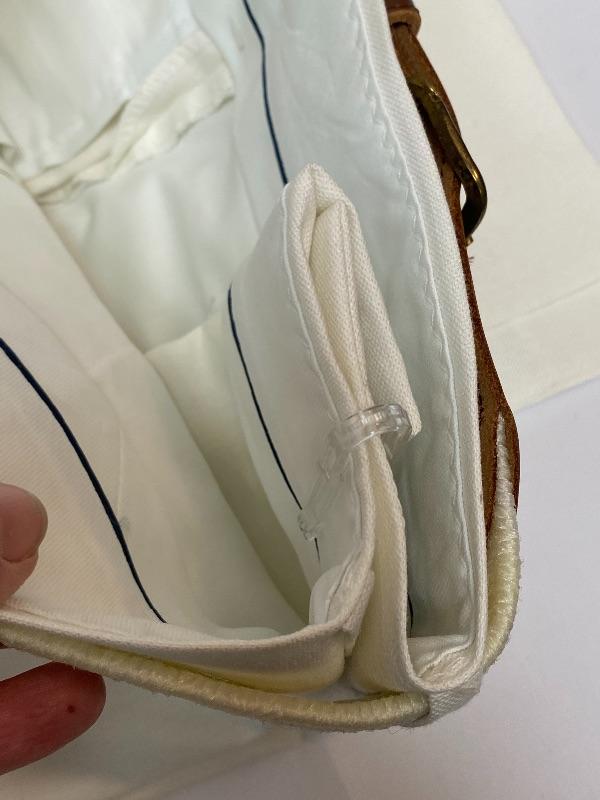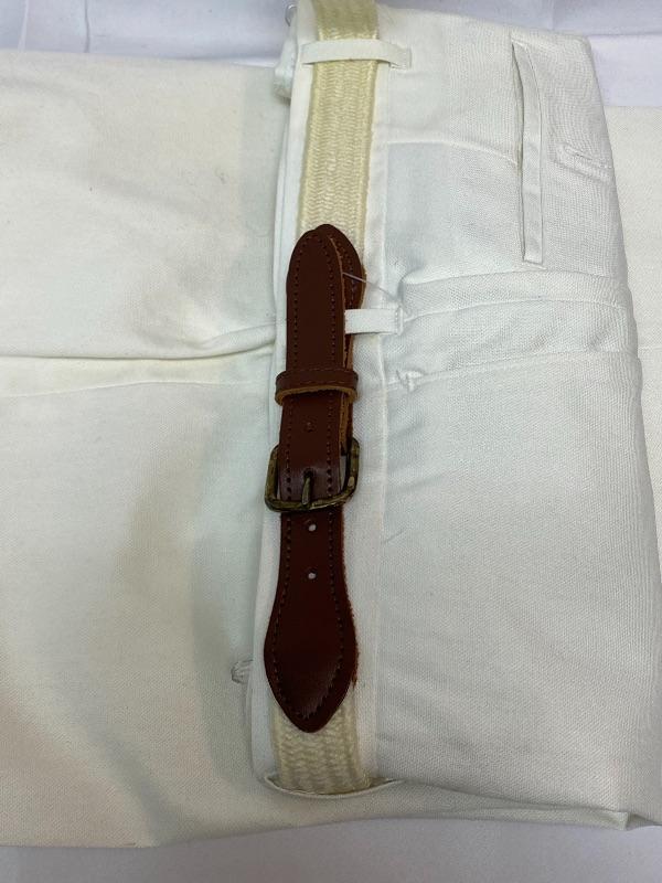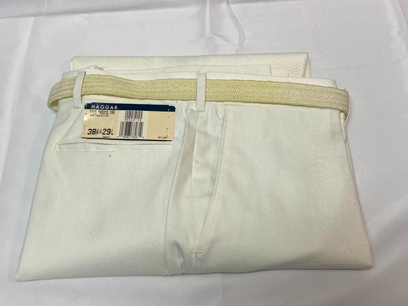New, old stock with tags attached. Haggar men's white pants with belt. Dress slacks size 38w with 29" inseam. May have discolor from being in closet, did not notice any obvious spots, stains, or holes.