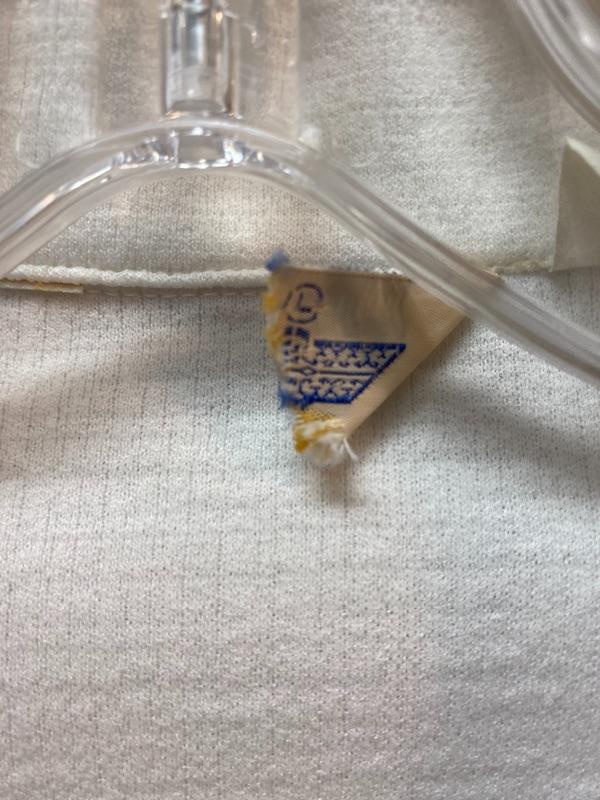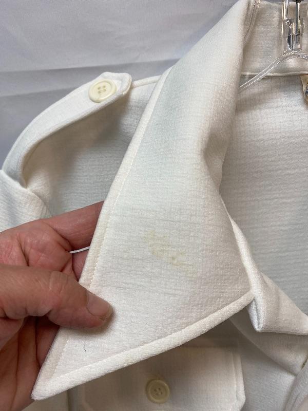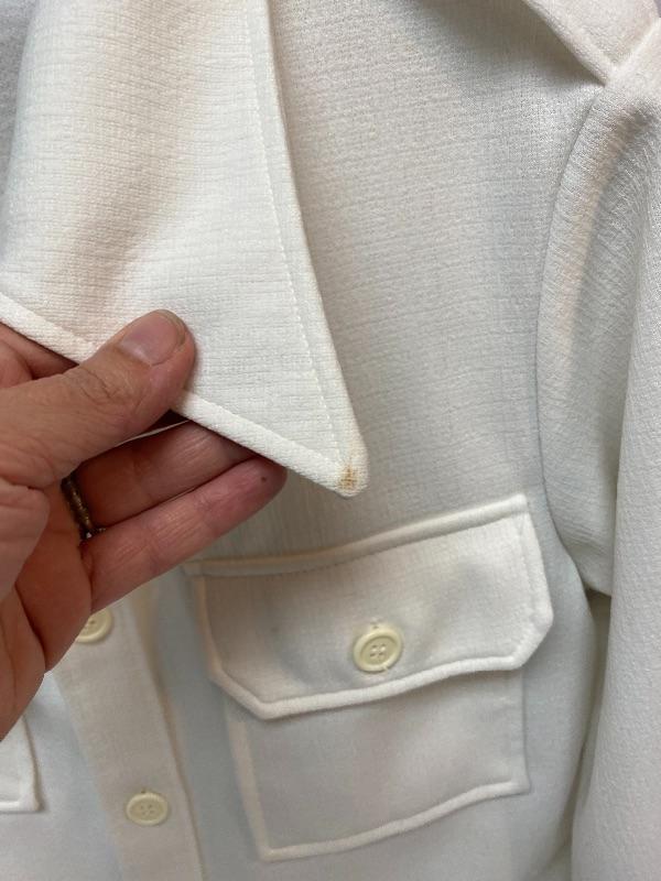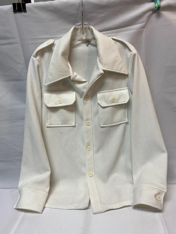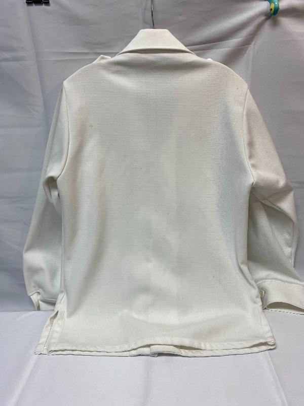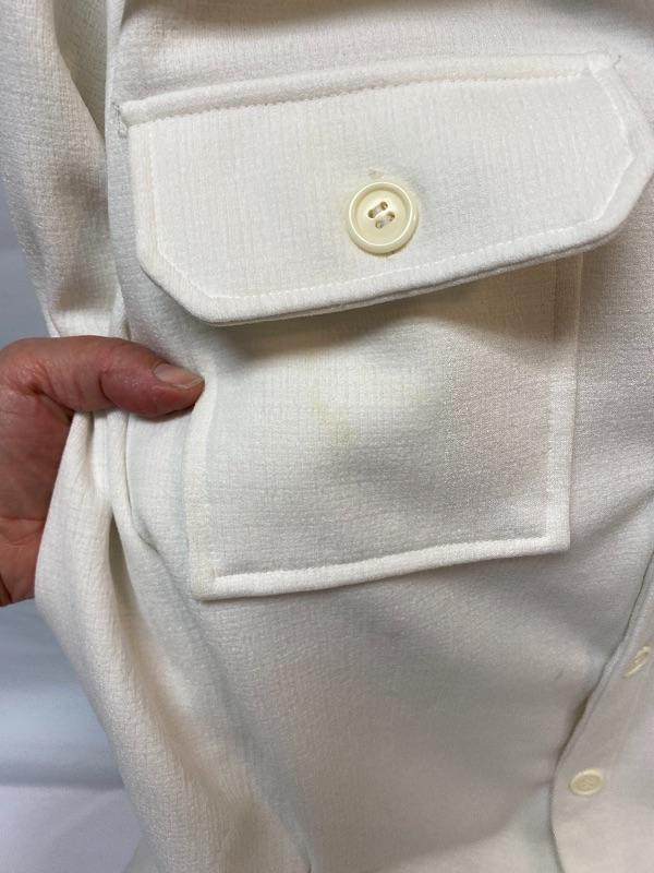 Retro white polyester button front shirt. Could be worn as a light weight coat. Pointed collar, breast pockets. There are some light spots, not sure if they would come out if washed. Partial tag inside, possibly a size large. Great for costume parties, Halloween, or vintage fun.