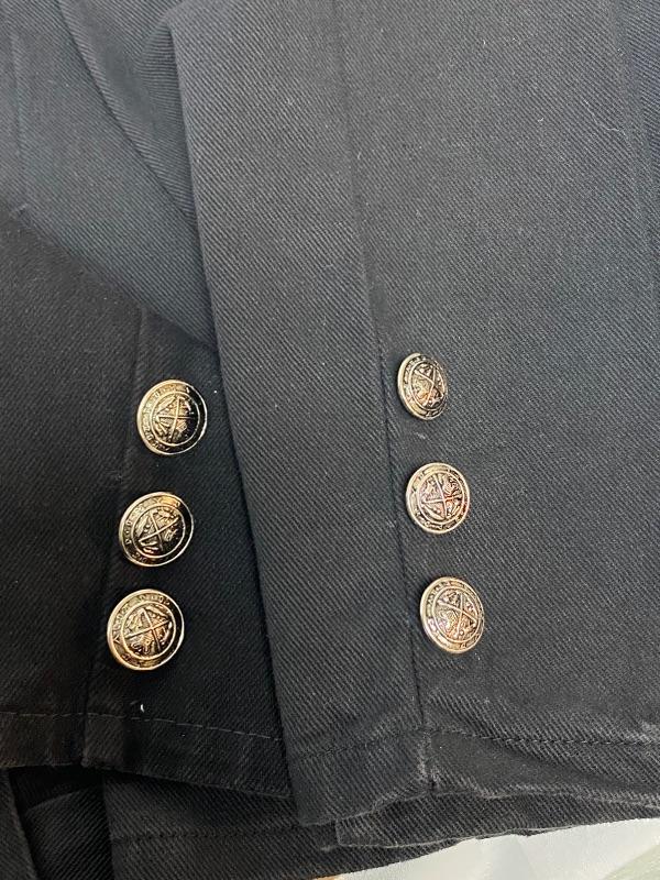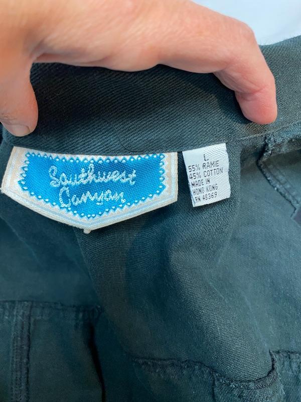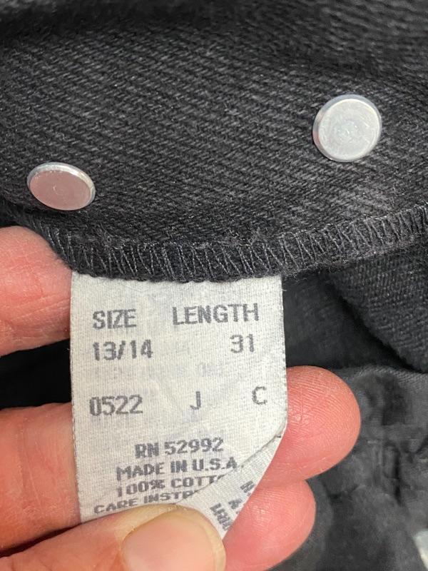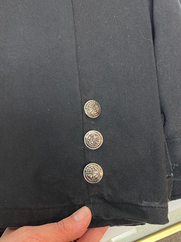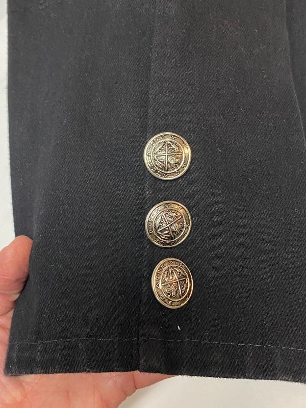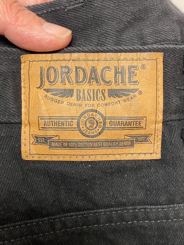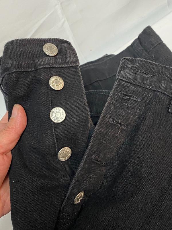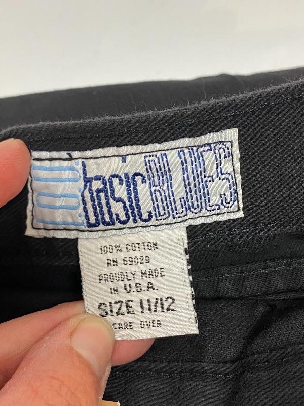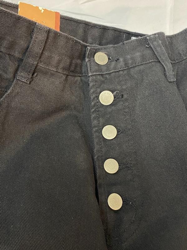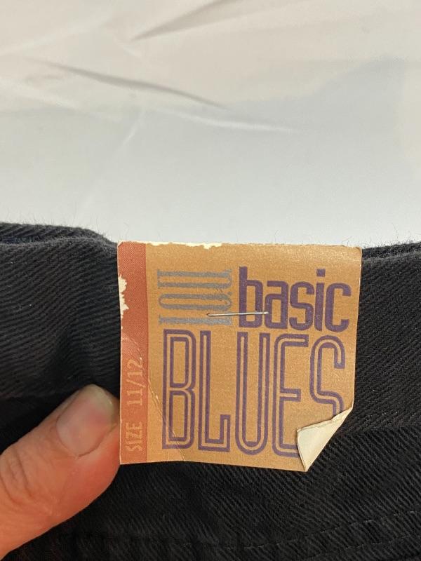 Women's black denim lot. Black denim vest in size large. Two pairs of denim pants. Both are button fly. Jordache Basics in size 13/14. Lou Basic Blues in size 11/12, has original tags attached. Both pairs look like straight leg cut. Button detail at the ankle may have been added, buttons are identical just different sizes. Vest has some fade to it.