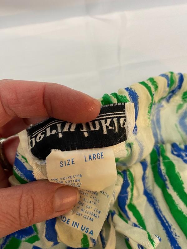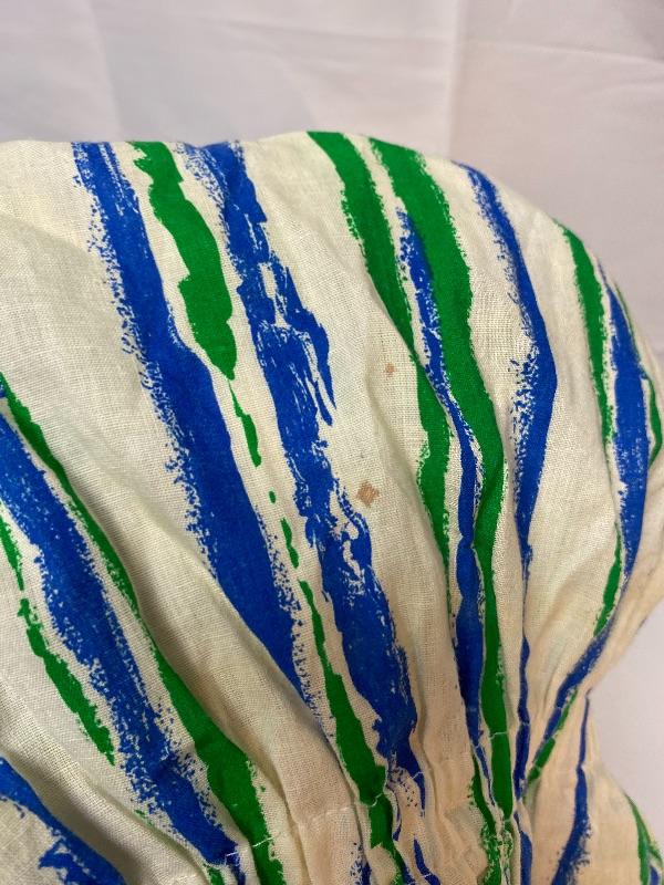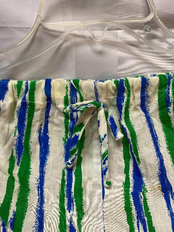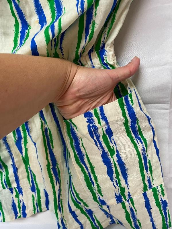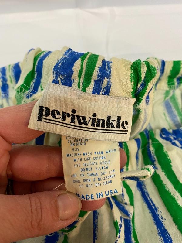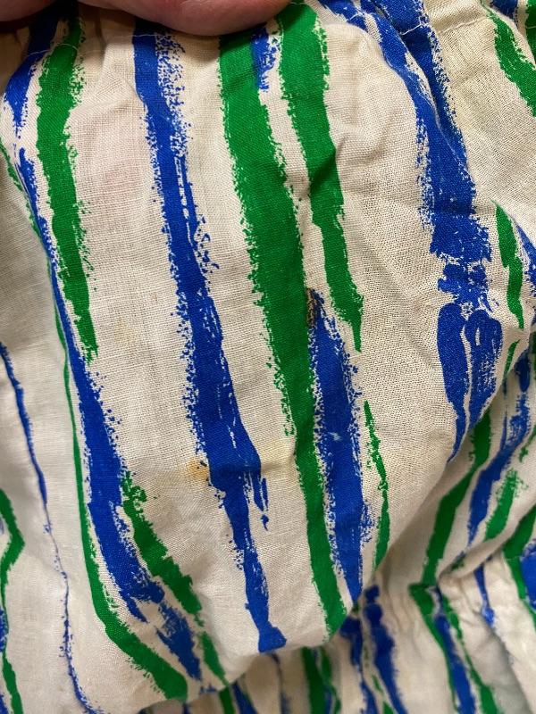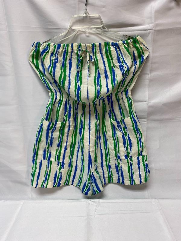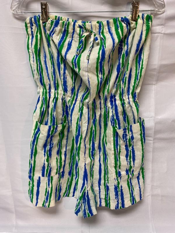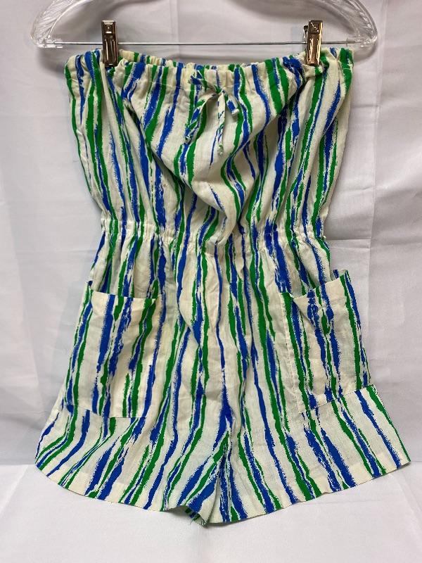 Retro Perwinkle women's romper. Super cute strapless shorts romper. Blue and green striped pattern. Front pockets, elastic at the waist. There is some discolor and a couple spots, not sure how much will come out with washing. No holes. Elastic is still good. Spots are small and not very obvious. Size large.