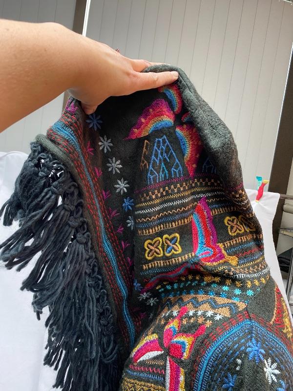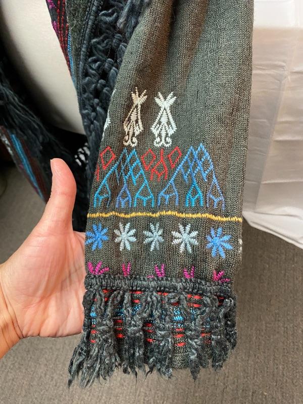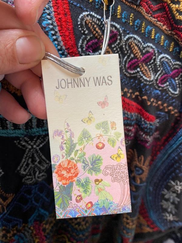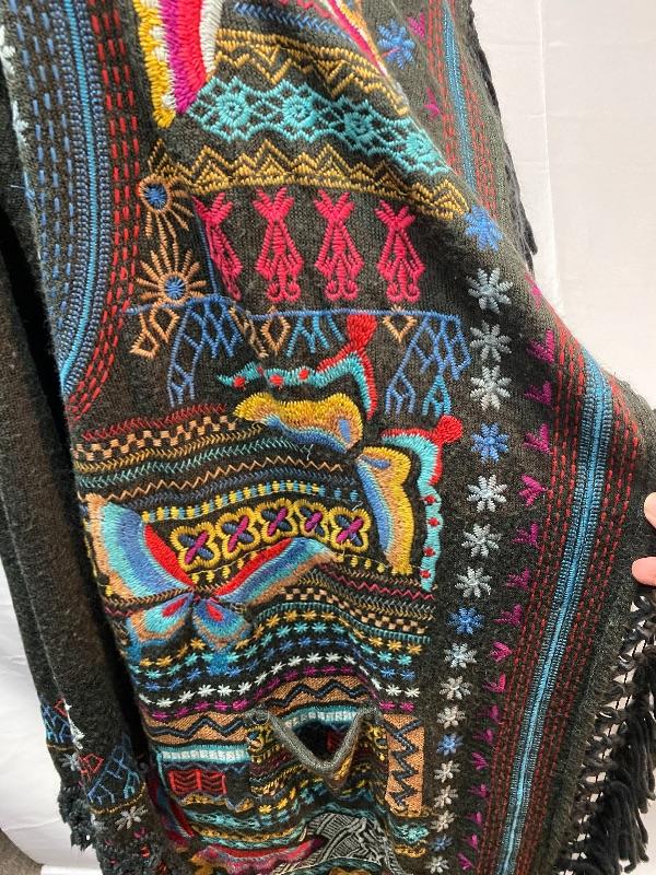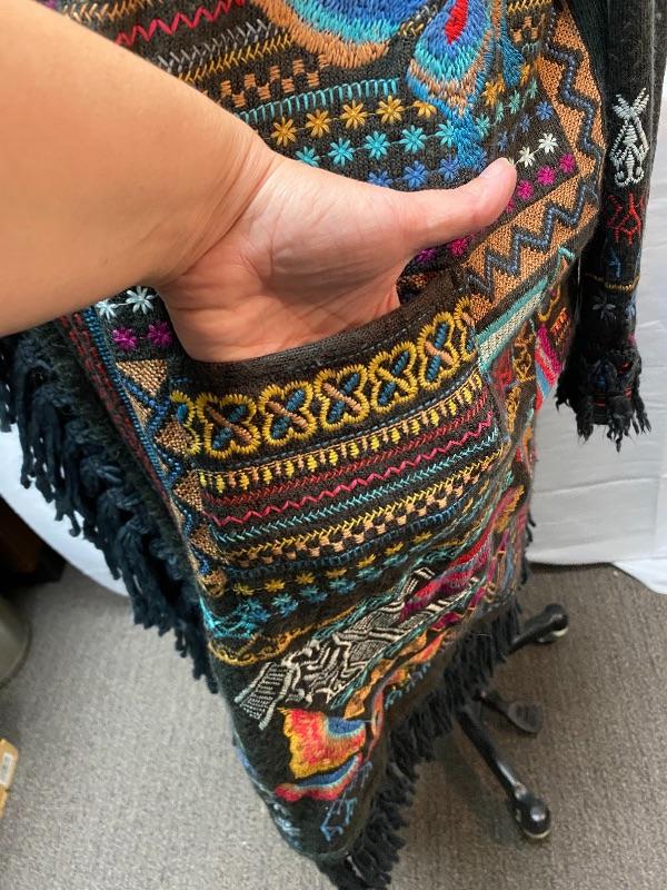 New with tags!! Black fully embroidered Johnny Was duster coat. Fringed hooded jacket. Colorful embroidered pattern completely covers the coat. Excellent condition, has original tags. Size large. MSRP retail price on tag is $508.