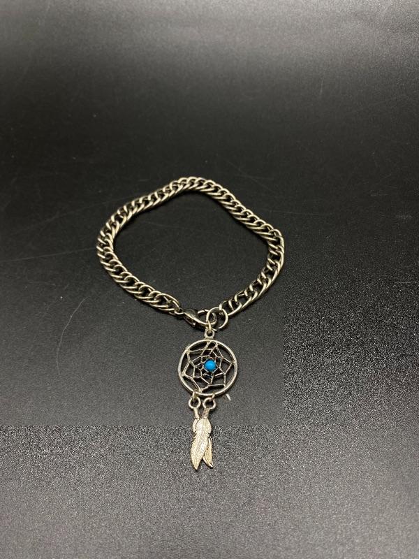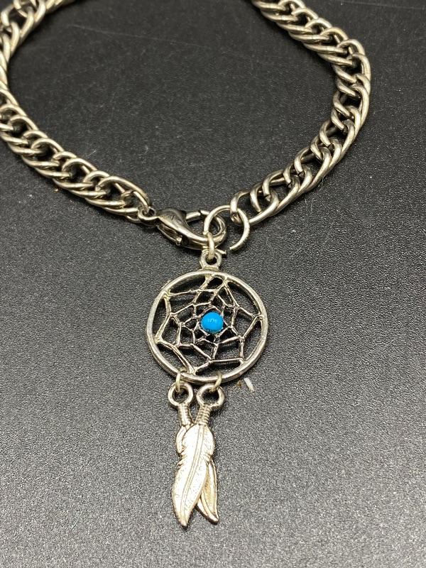 Silver tone dream catcher charm bracelet. Dream catcher has small turquoise like stone in center. Not sterling marked.