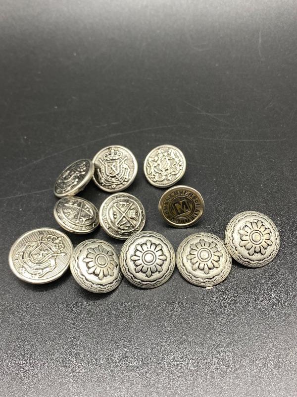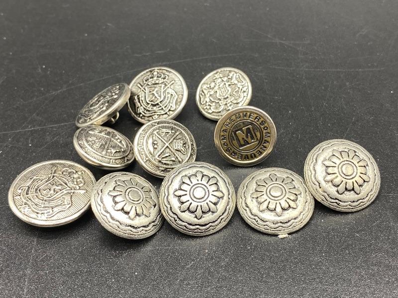Silver tone medallion button lot. 11 buttons, different designs and sizes. Under 1" size.