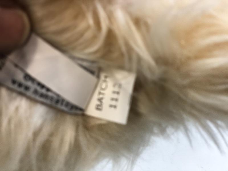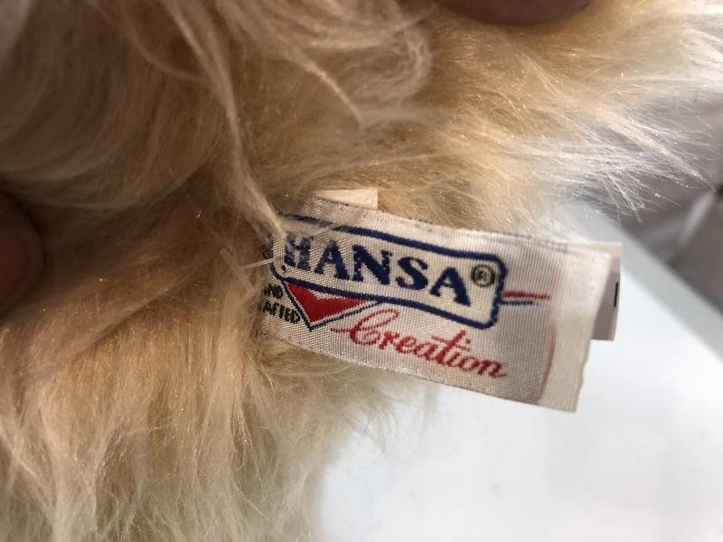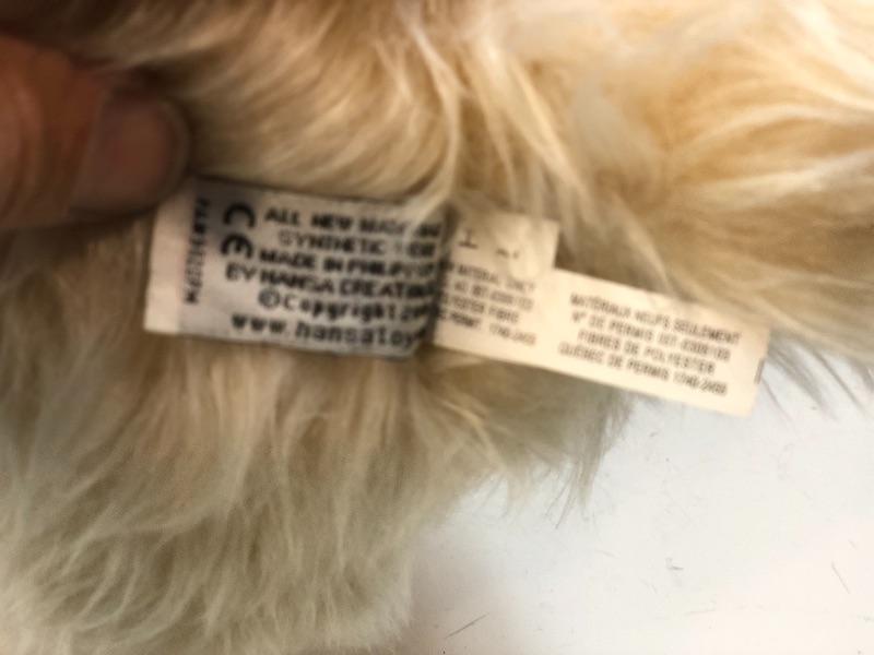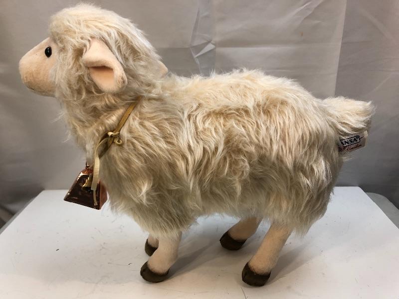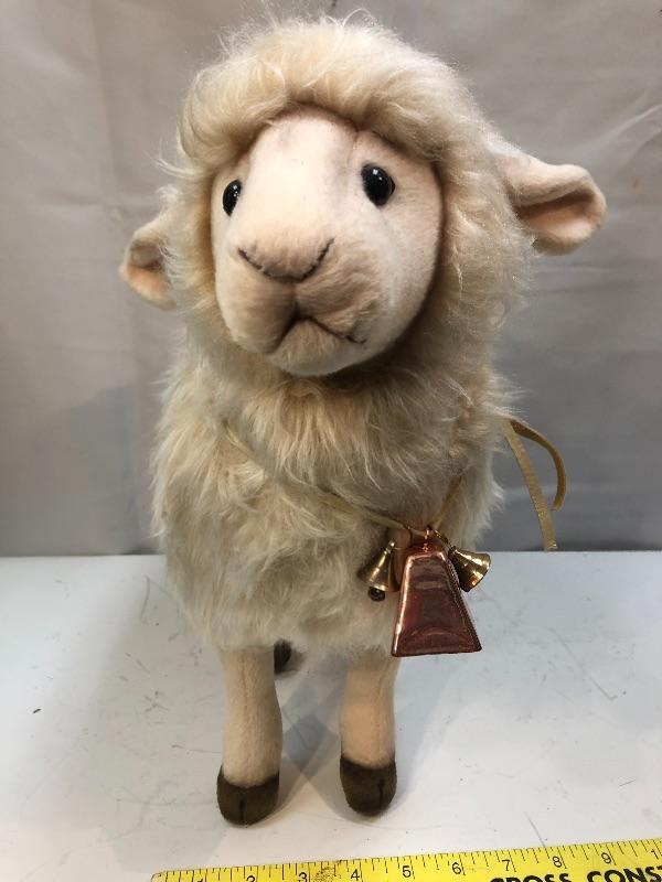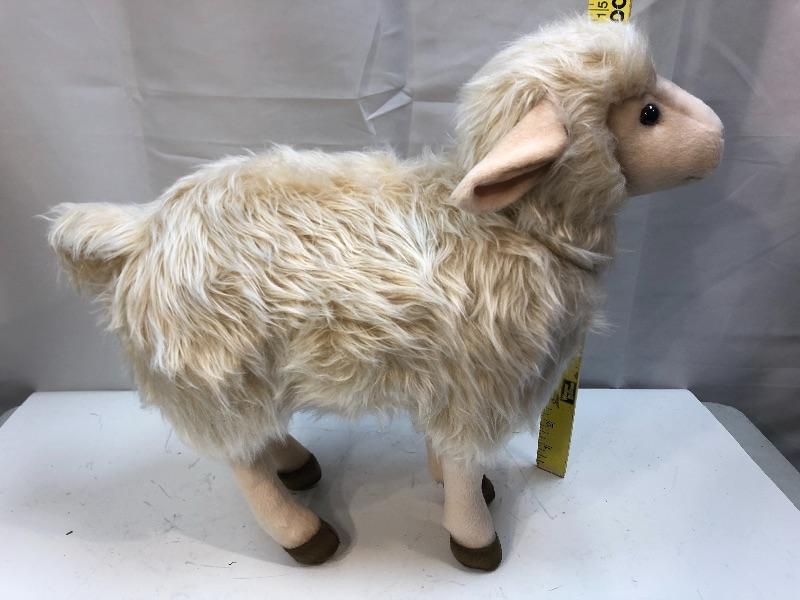 White & beige Hansa Creations wooly sheep plush. About 16" tall. Adorable stuffed animal.