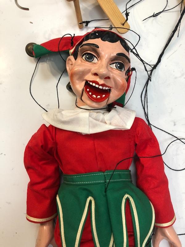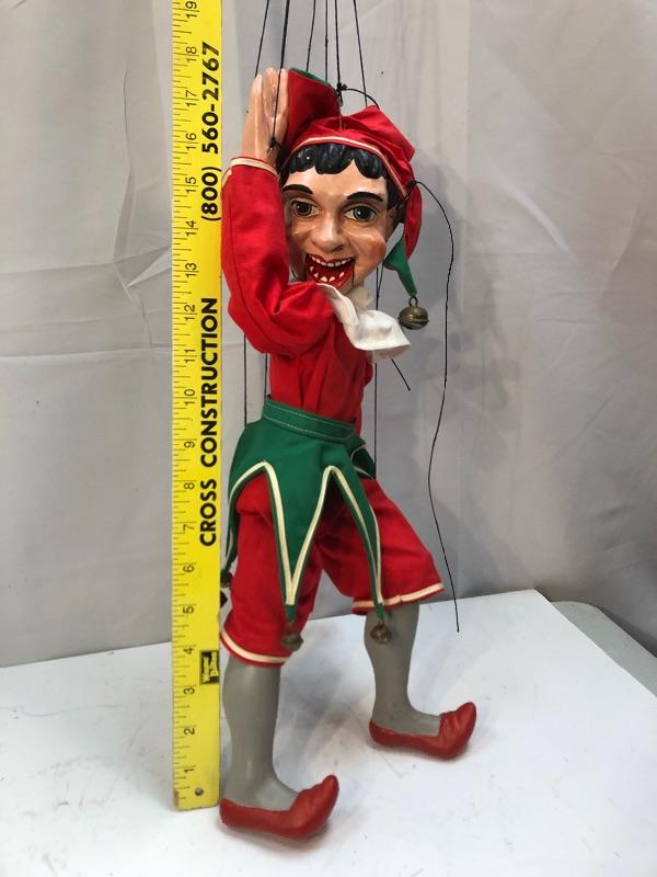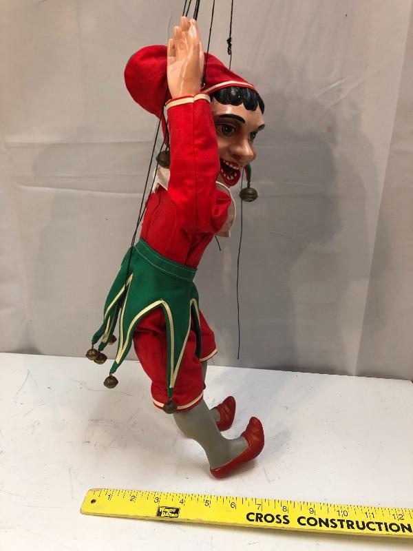 Red and green jester marionette puppet. Kinda creepy looking ventriloquist string puppet. Needs a couple strings repaired. About 16" tall with out strings.