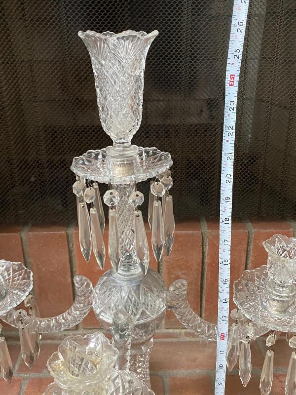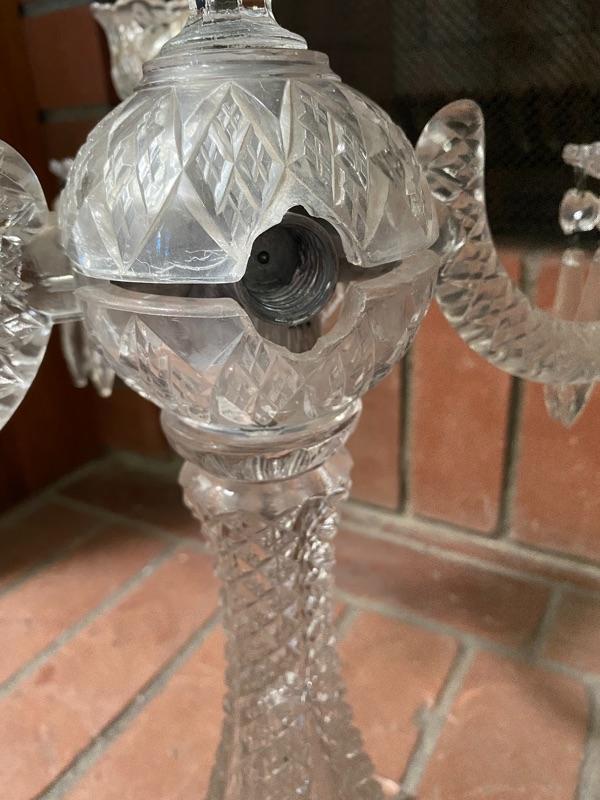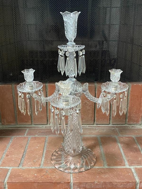 Vintage pressed glass candelabra. Holds four taper candles total, one center with three arms. Crystal shards hanging from wax catchers. Looks like it is missing an arm from one side, but the missing arm allows it to sit close to wall. Stands about 26" tall and is about 18.5" wide. No obvious damage noticed other then missing arm. #24-10043
