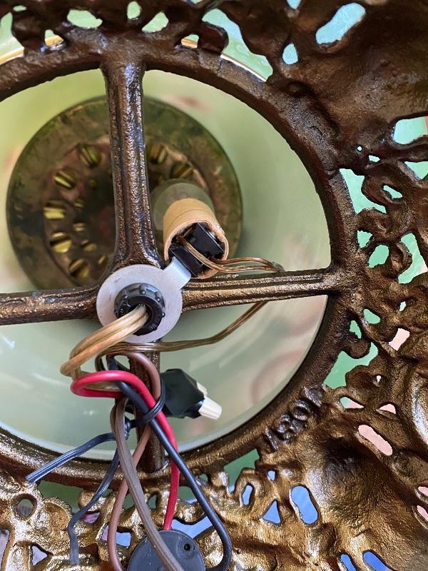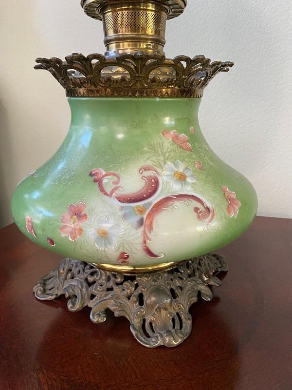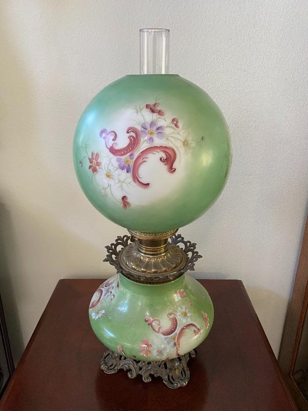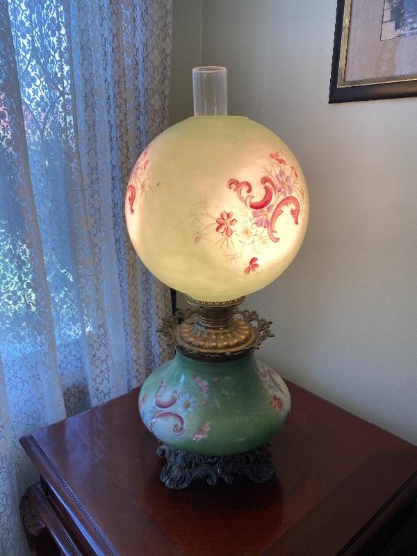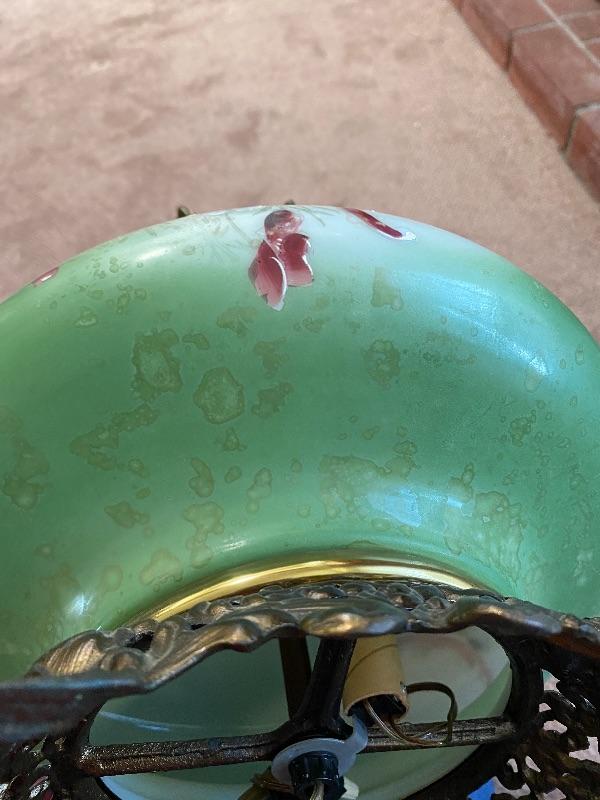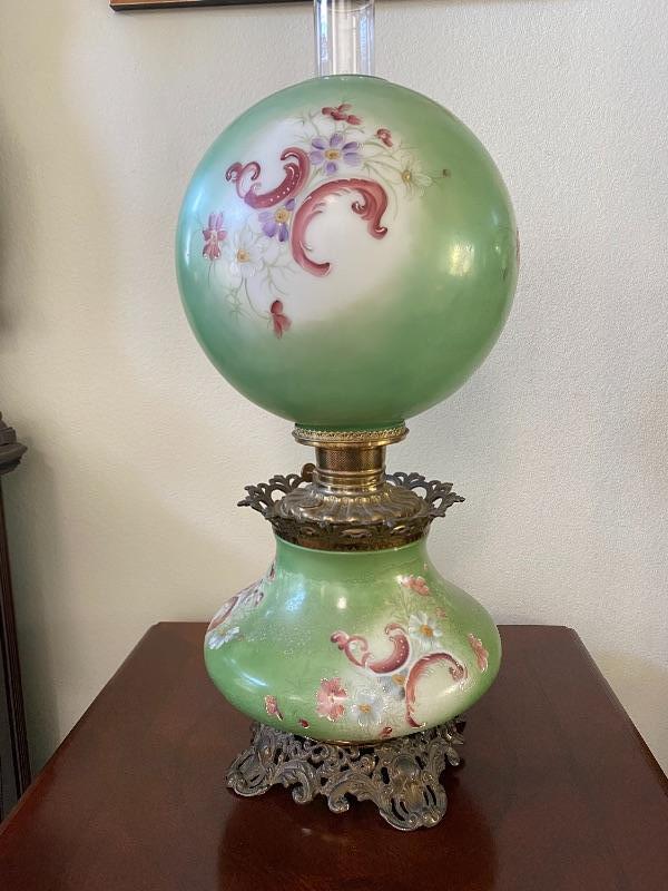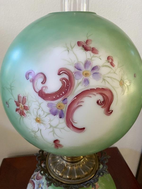 Antique green globe success table lamp. Victorian style lamp, green with a flower pattern painted on it. It should light up on top and bottom but the bottom is not lighting, possibly a burnt bulb. No chips, there is a speckling near bottom, not sure if it is cleanable. #24-10013