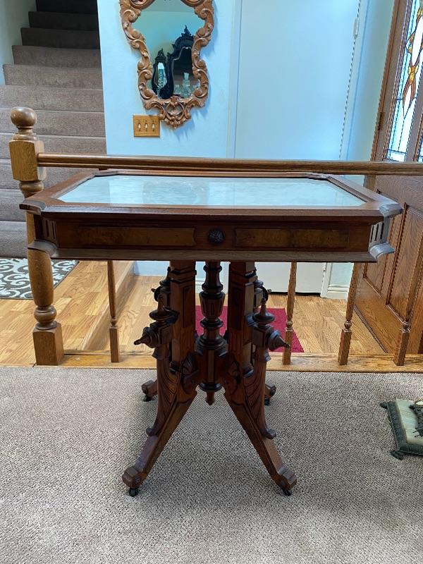 Beautiful wood and marble side table. Eastlake style end table, ornate carved table legs on wheels. The top wood frame gives the marble a finished look but lifts off to remove marble surface. Marble is cut a to short along one edge, you can see cut near wood frame edge. Overall condition is good, well kept. Not quite a perfect square table measures about 24"x32" and is 31" tall. #24-10000