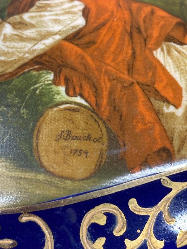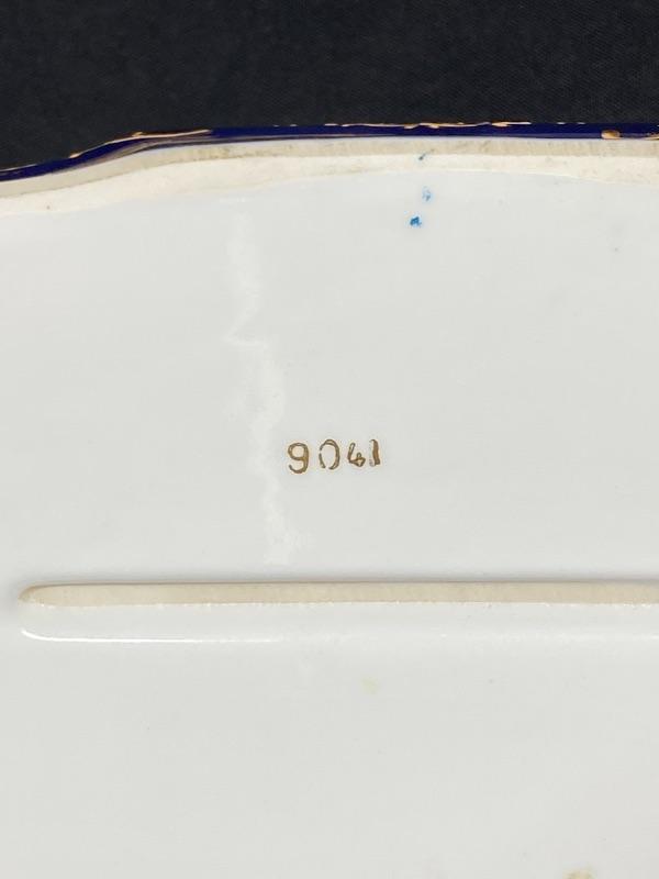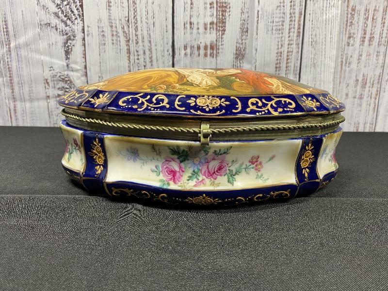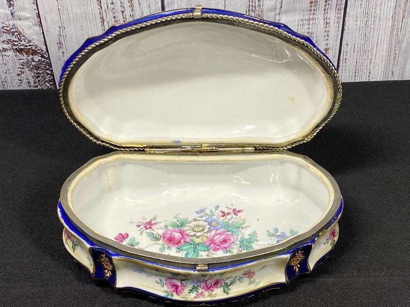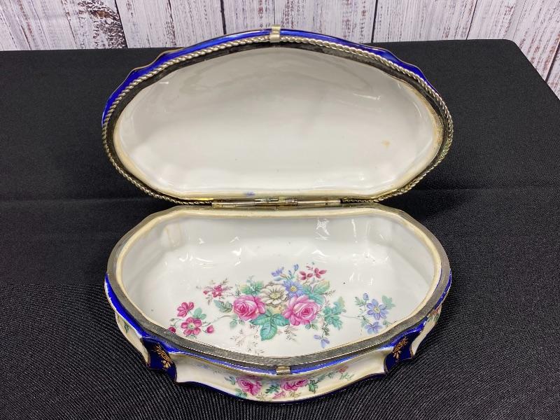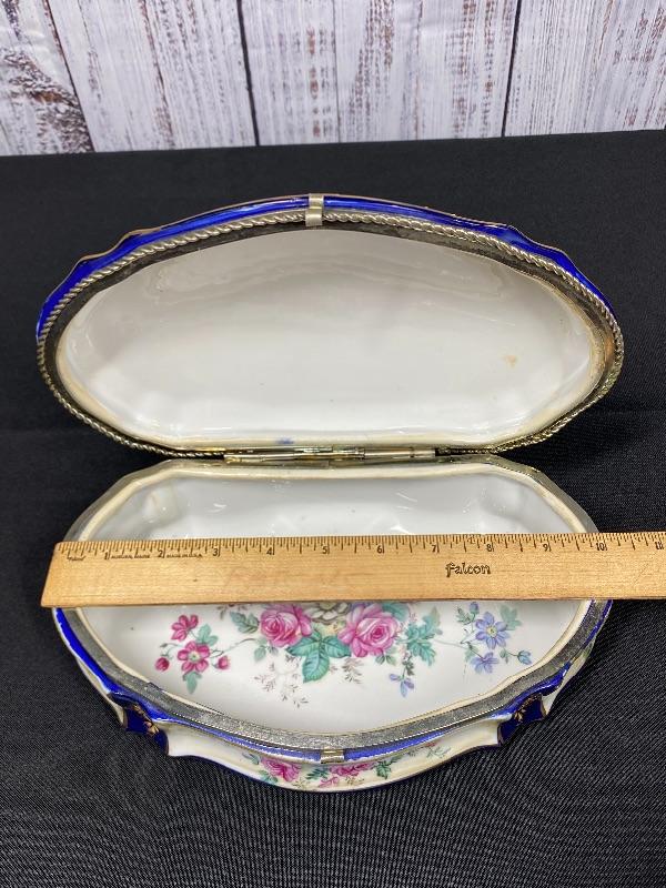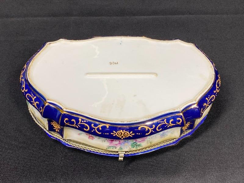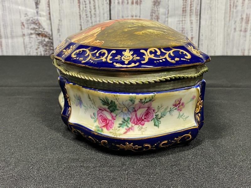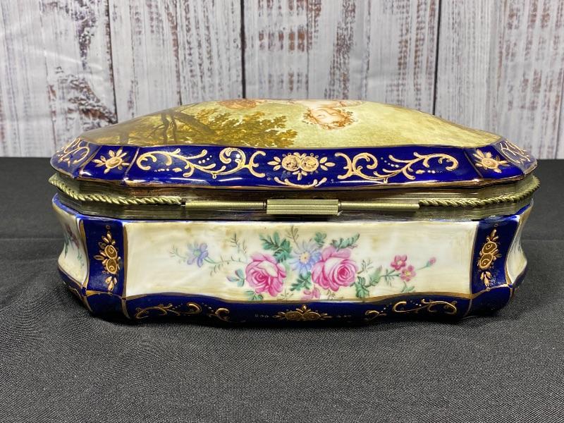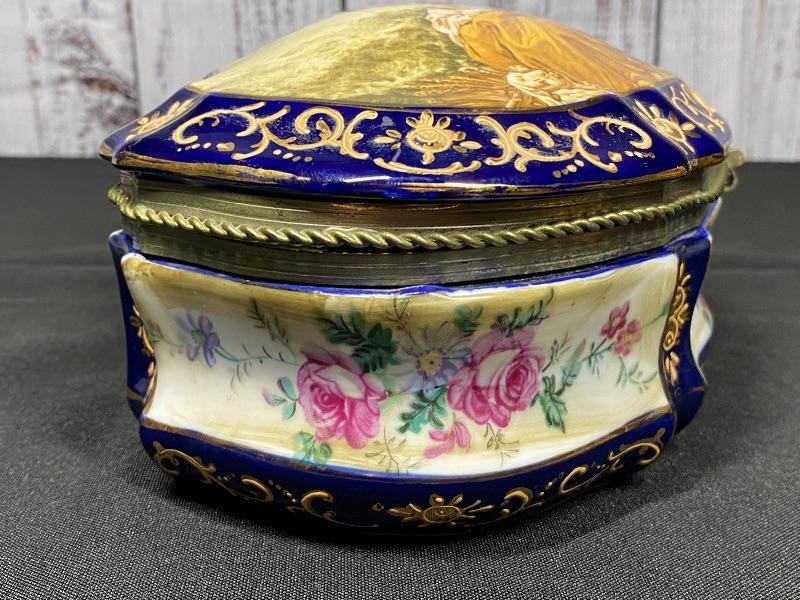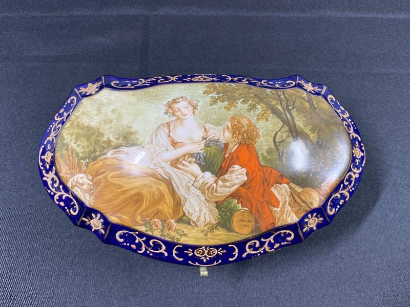 Large lidded Victorian trinket box. Victorian courting image has been printed on, not painted. Hinged lid, Floral pattern painted inside. In good vintage condition. Measures about 10" across. Cobalt and gold detail around the edges. No chips noted. The bottom is marked "9041".