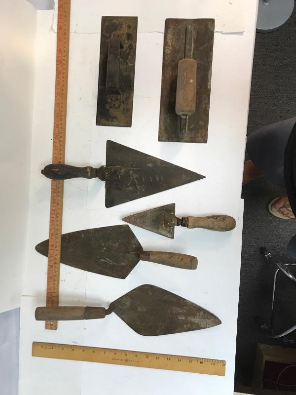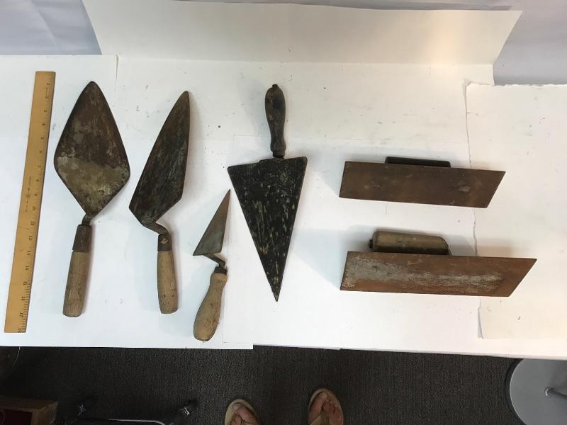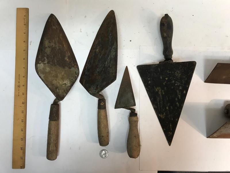 Lot of 6 hand trowels for masonry or concrete work. 4 triangular, 2 rectangular. Used condition, some surface rust.