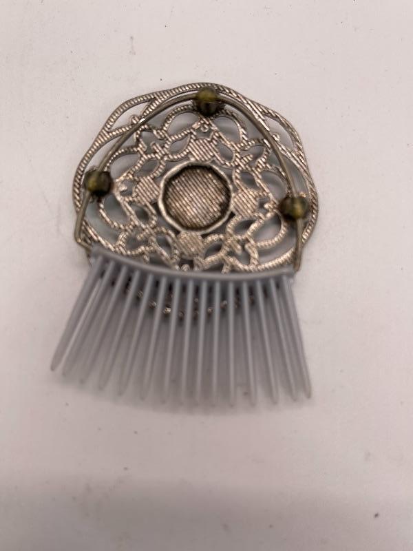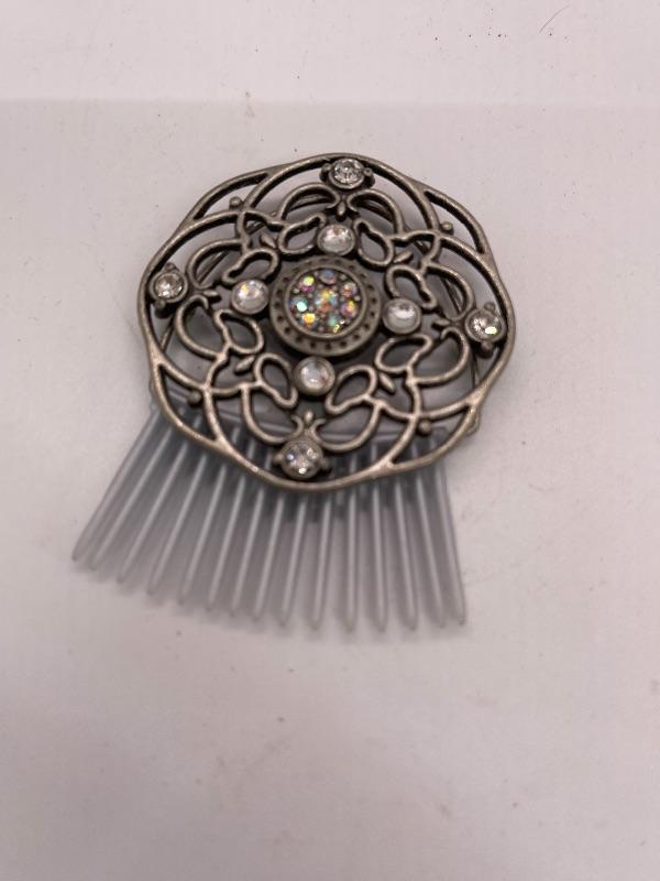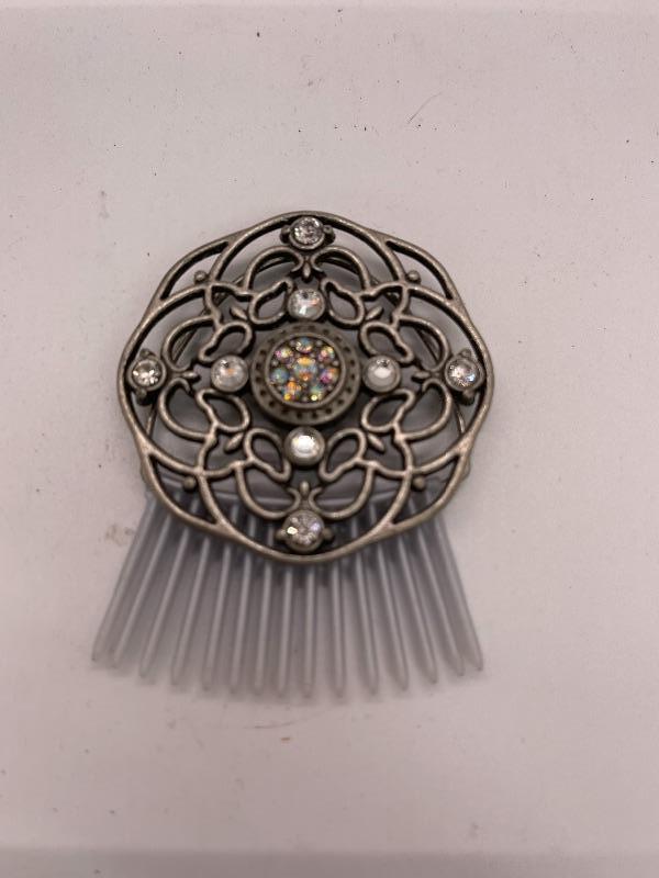 Decorative hair comb. Silver tone with rhinestones.