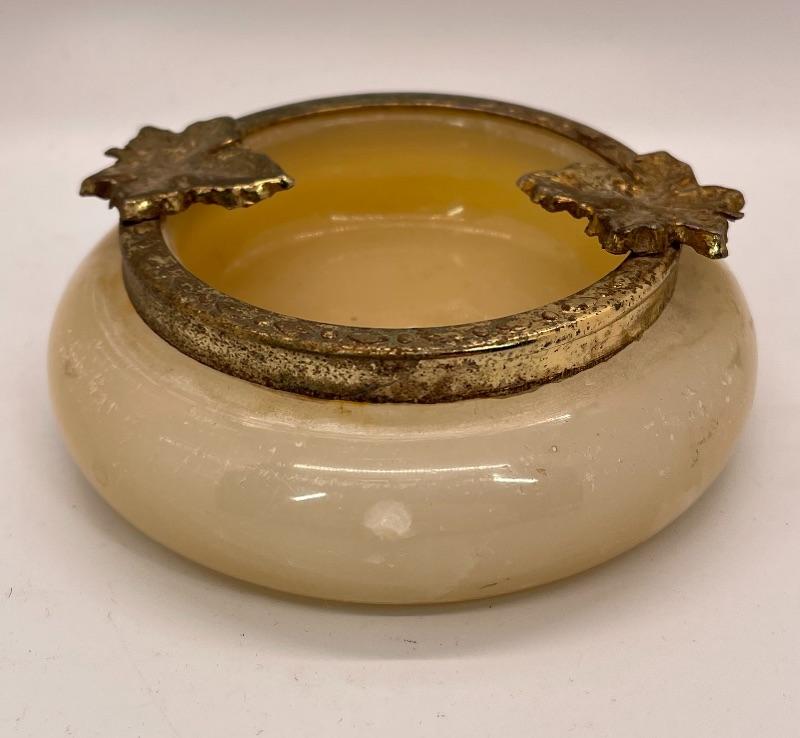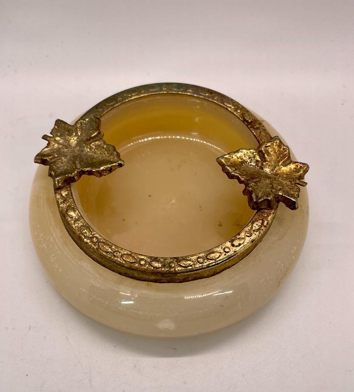 Vintage Art Nouveau style trinket dish. Metal rim, stone or slag glass base. About 4" size. #022-0493