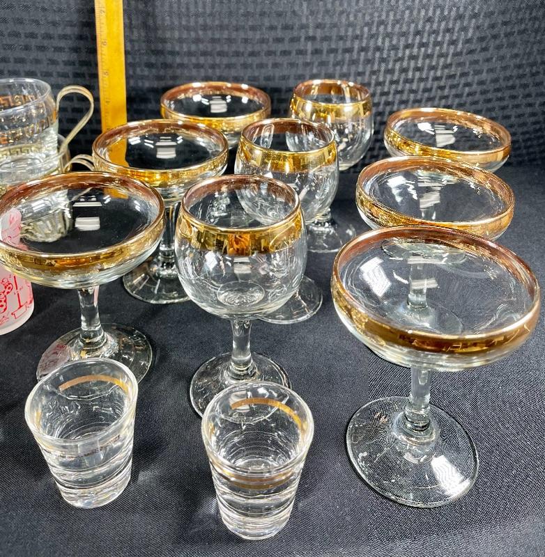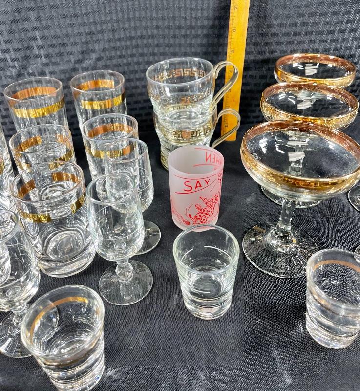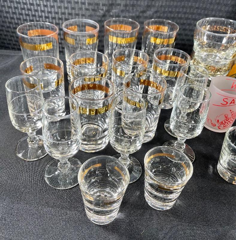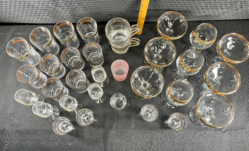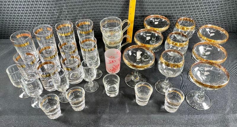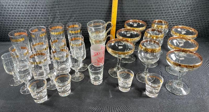 Mixed lot of glassware. Most are gold rimmed pieces. Various conditions of wear. No chips.