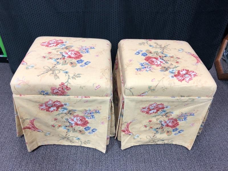 Matching pair of floral ottomans. Cushioned Stools are in a pale yellow fabric with pink and blue floral pattern. Good condition.