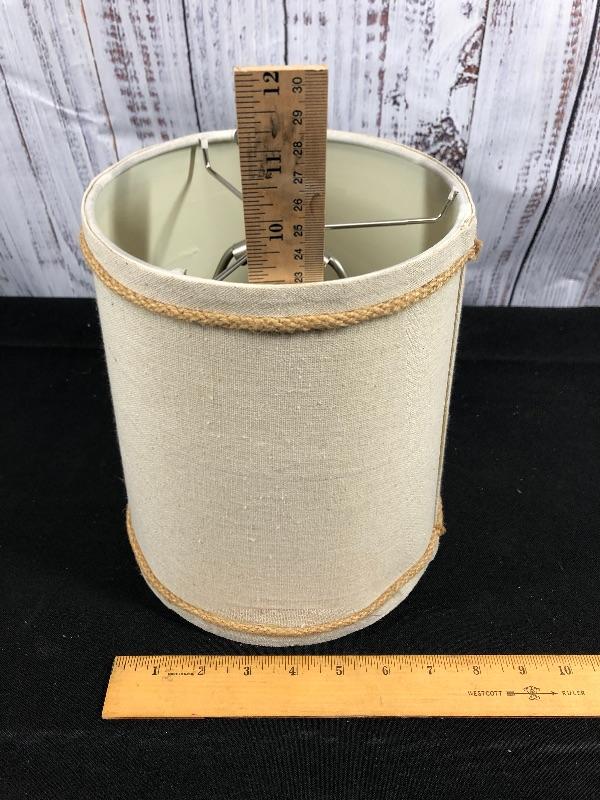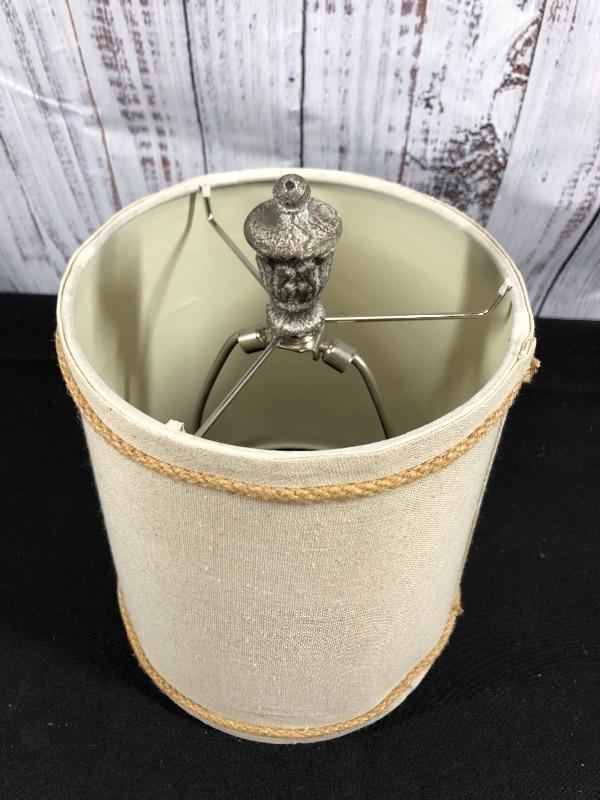 Small off white lamp shade. Has lamp bracket attached by silver tone finial. About 10" shade. #028-002