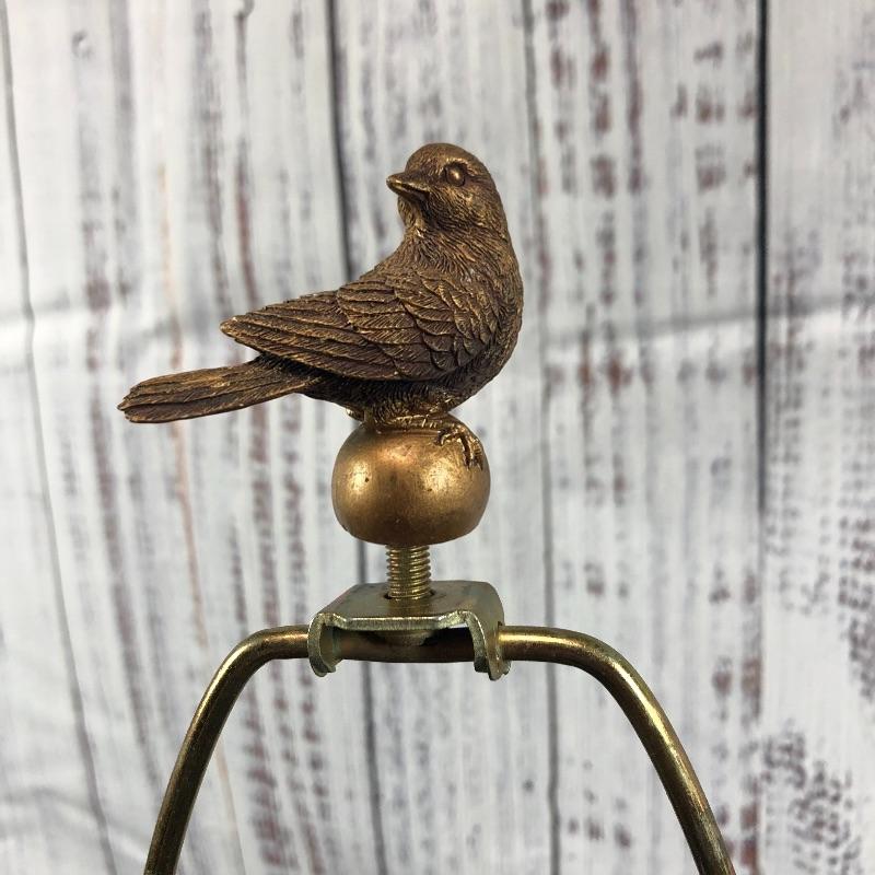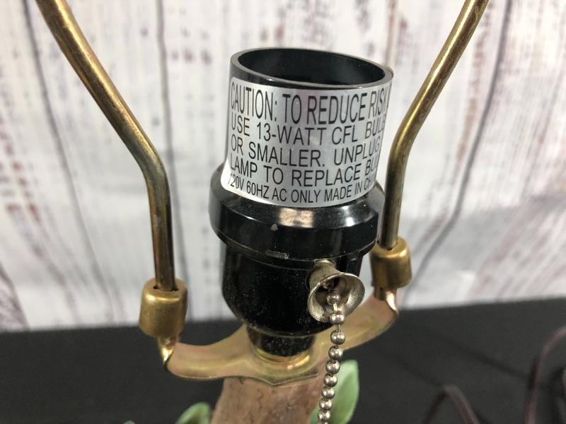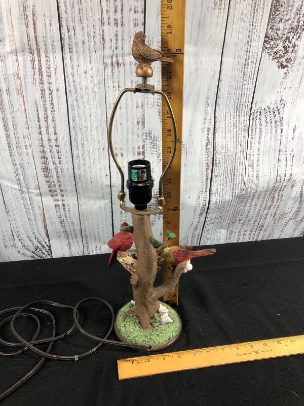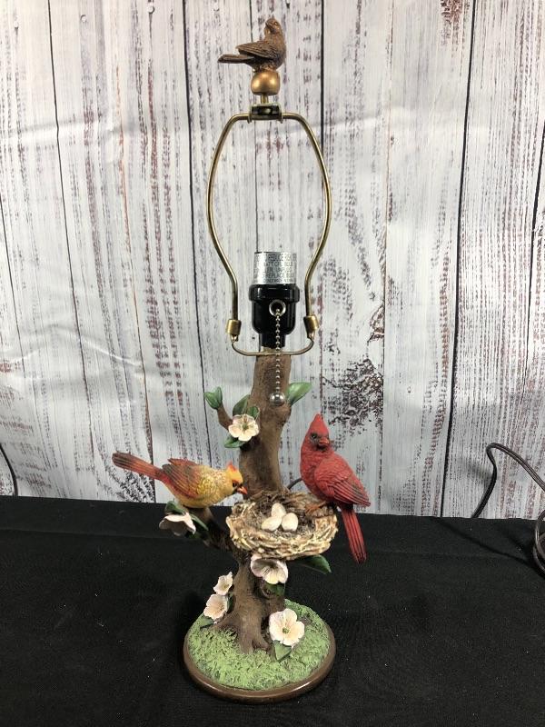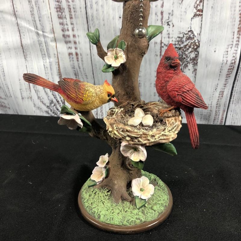 Nature theme lamp base. Features a pair of cardinal birds with their nest on a branch. Bird shaped finial on top. Pull chain on/off. Stand about 19" with the finial. Felted bottom to protect surfaces. #028-014