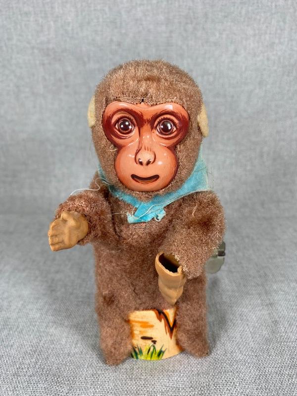 Vintage fuzzy monkey mechanical tin toy. Looks very similar to the shoe shine monkey but missing his shoe shining accessories. One hand needs to be repaired slightly. Made in Japan. About 6" tall. #020-00523