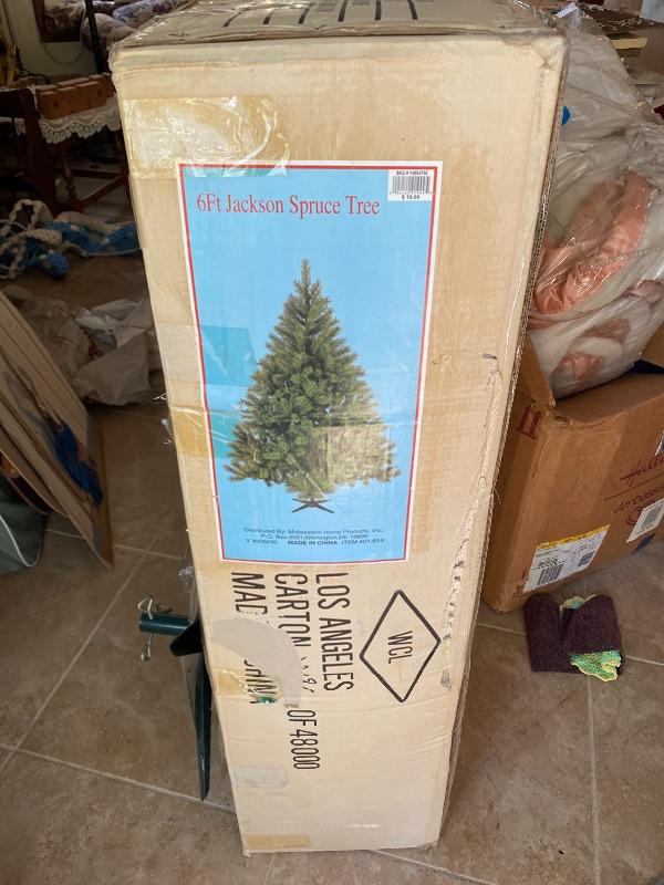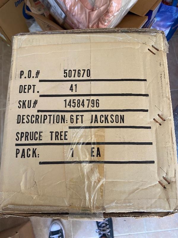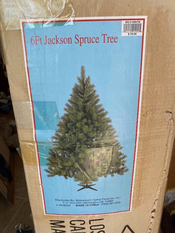 6' Jackson Spruce artificial Christmas tree. In original box, did not open, all taped up. Has tree stand taped to the outside of the box. #030-2001