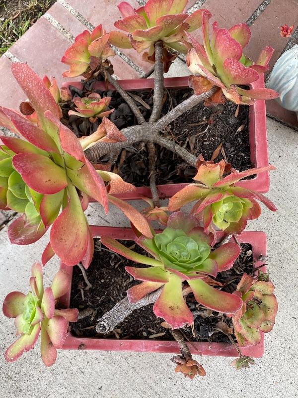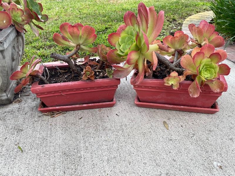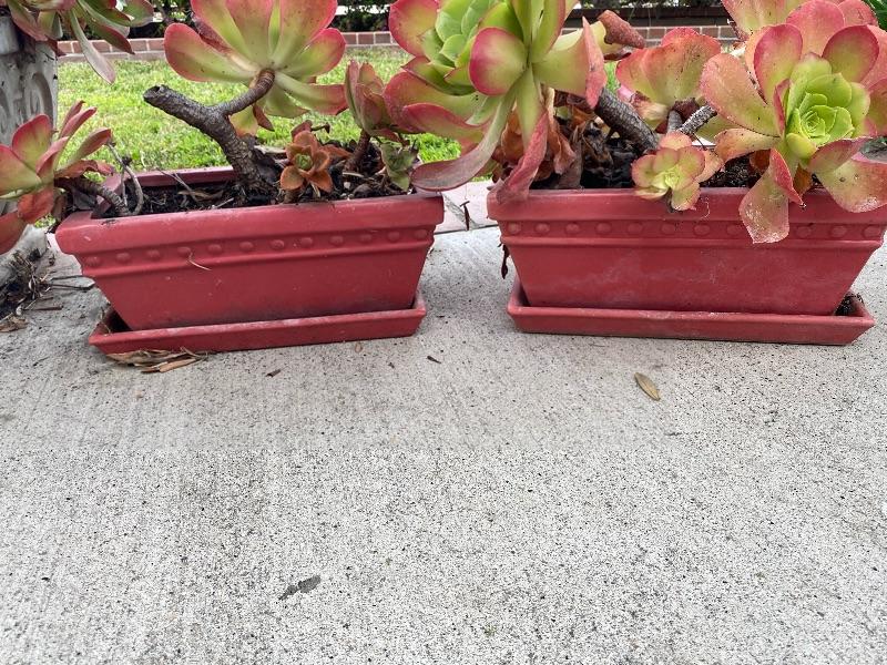Pair of matching red ceramic planters. Rectangle shape, about 12". Both have established succulent plants. #24-50022