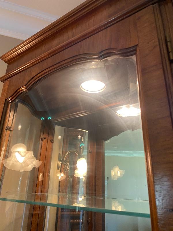 Wood & glass mirrored display cabinet. 6' cabinet has a mirrored back, light inside, and 4 glass shelves. Good condition. 3030-1034