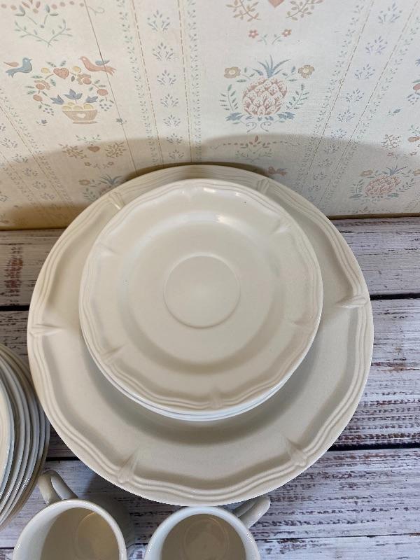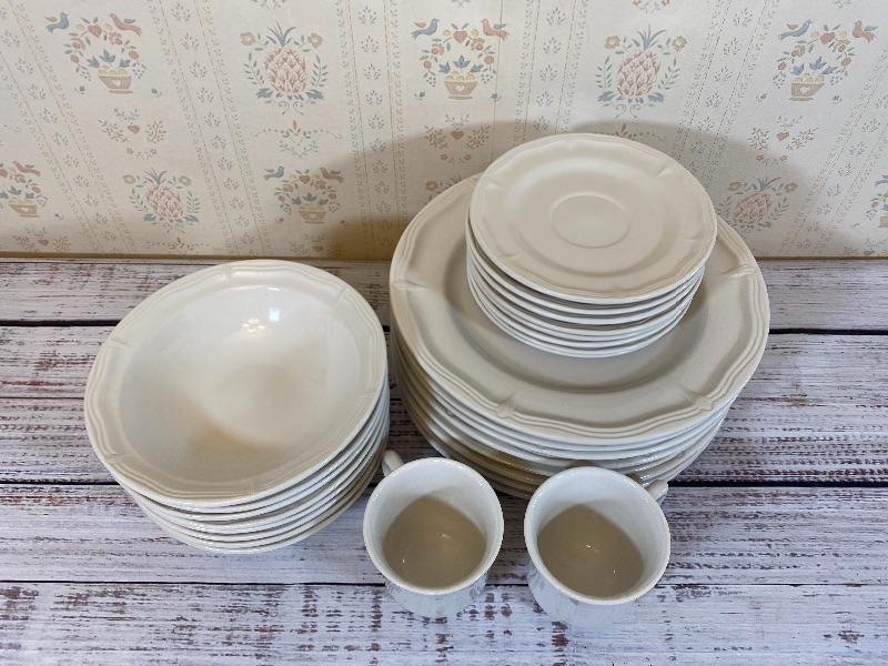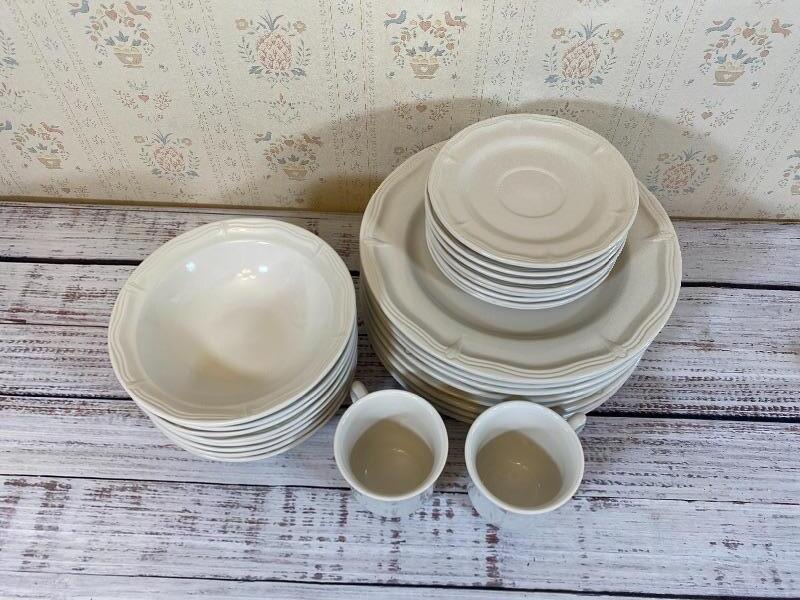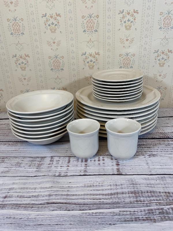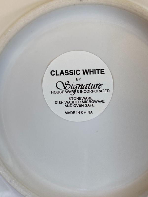 Classic White dishware by Signature House Wares Inc. Like the name says these are classic white dishes, great additions to any set. Stoneware, safe for oven, microwave, and dishwasher. Not a complete set, includes: 2 cups, 8 bowls, 8 saucers, and 8 dinner plates. #030-2014