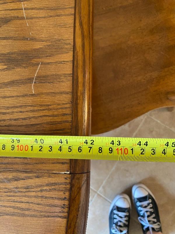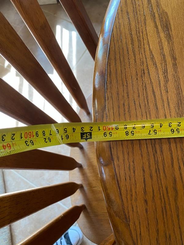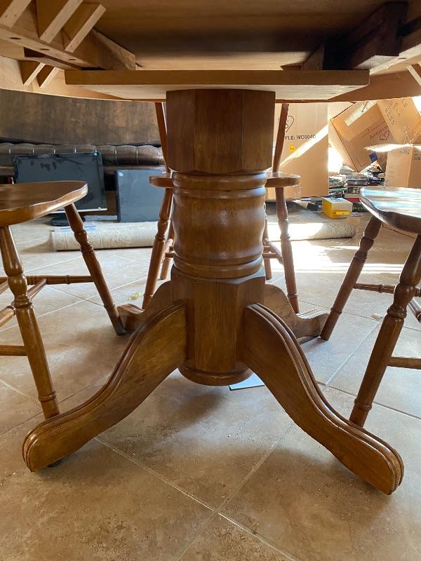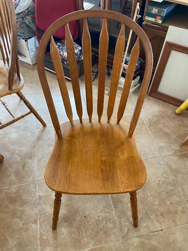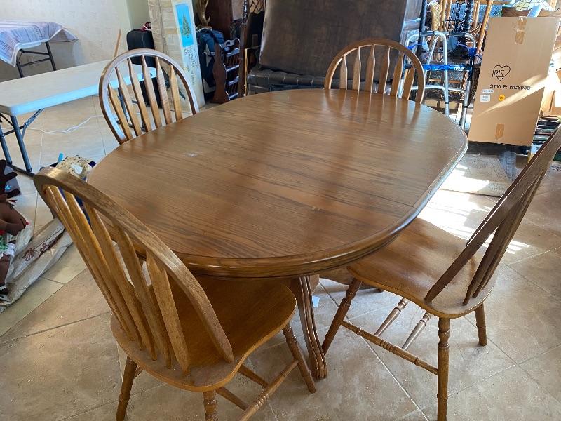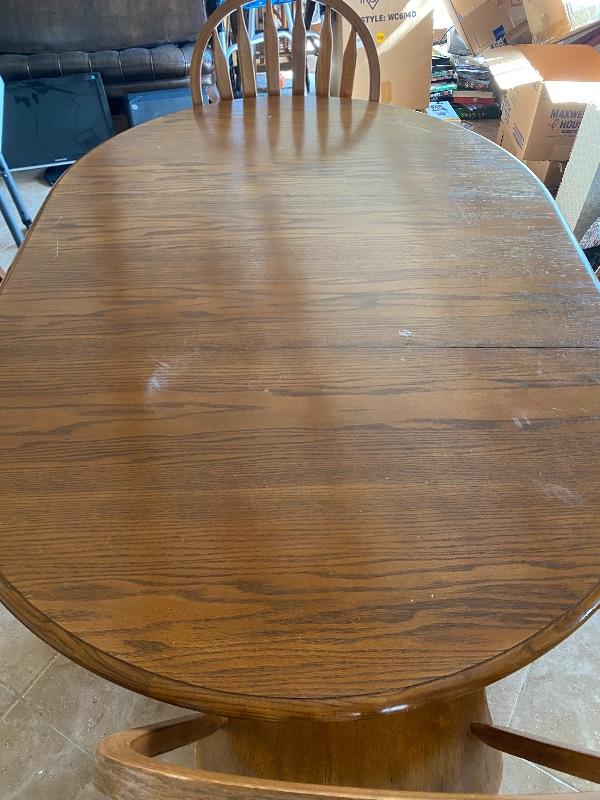 Oval oak dining room table with 4 chairs. good gently used condition. Table is expandable, but we have not found any leaves for it. Measures about 5' long.