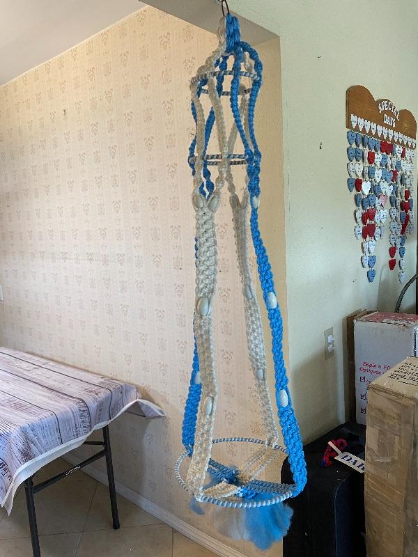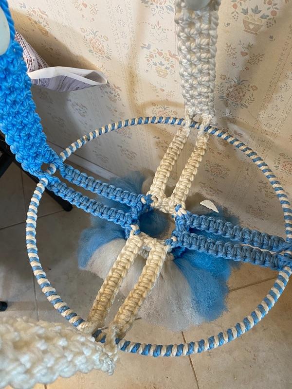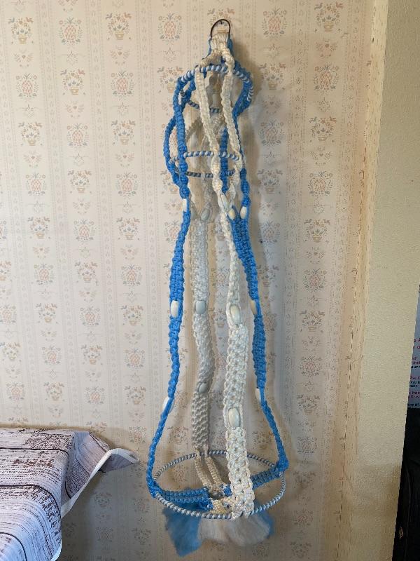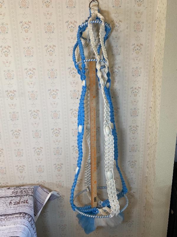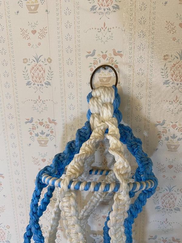 Vintage blue and white macrame plant holder. Hanging holder, a little stiff from age and storage but in good condition.