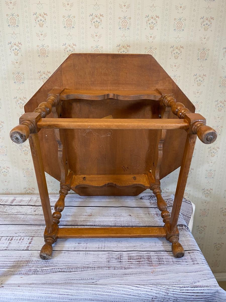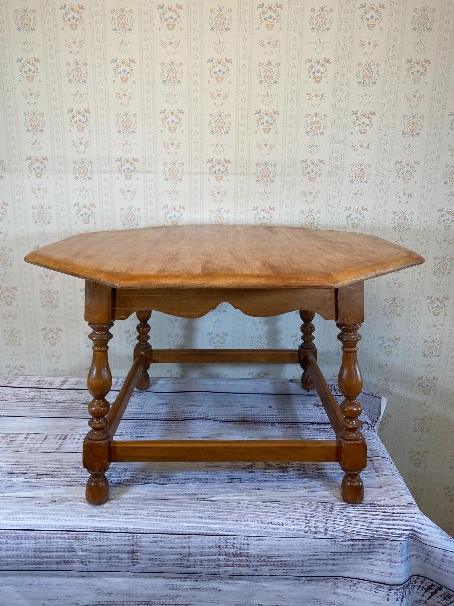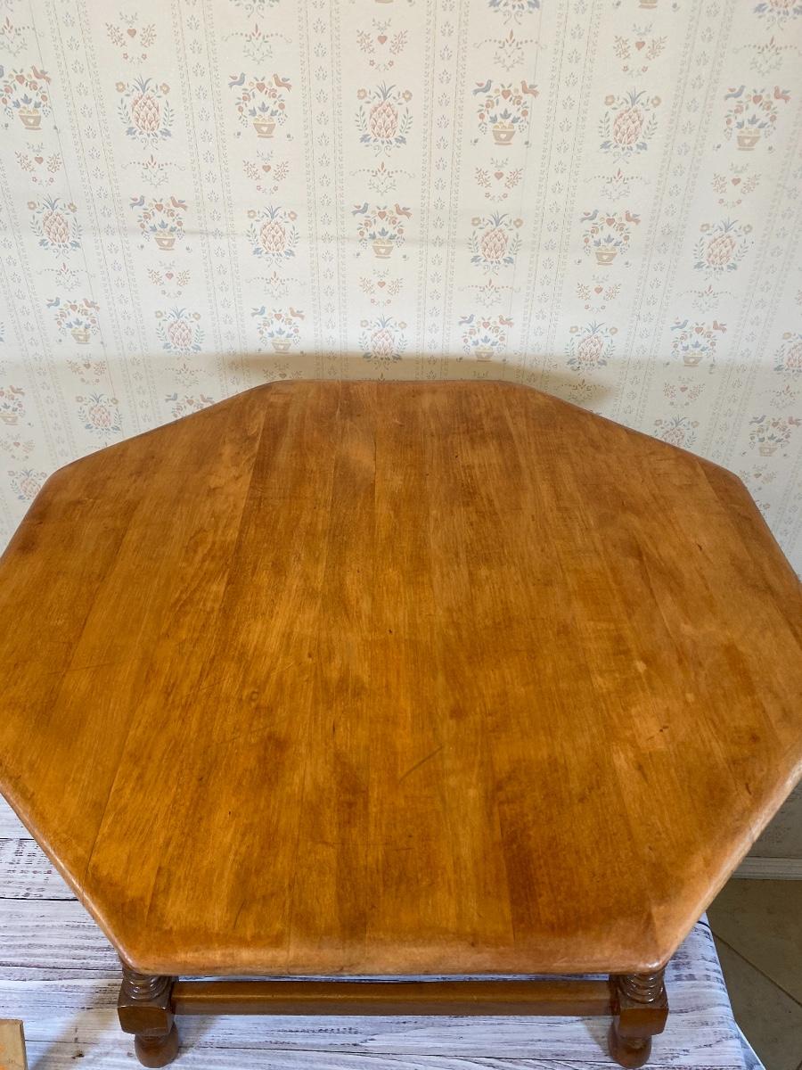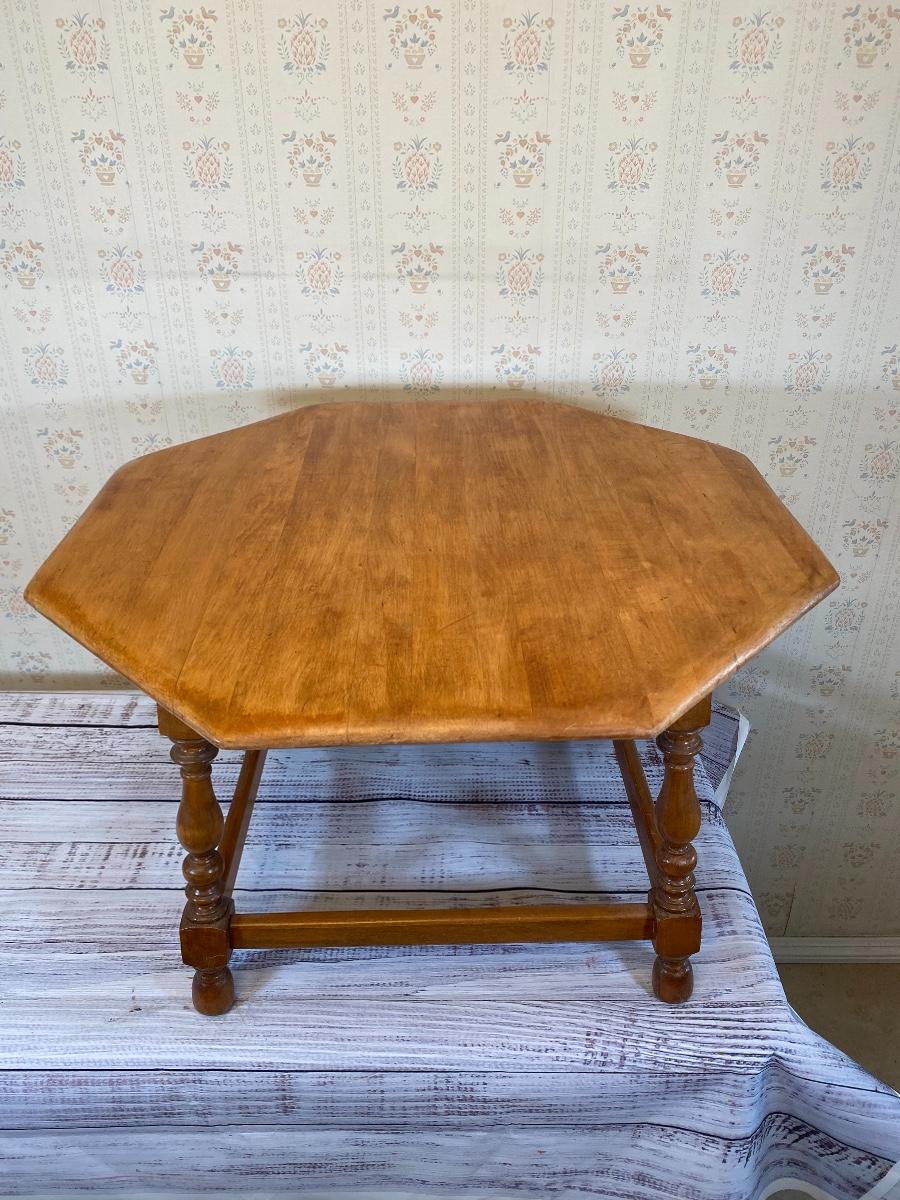 Vintage wood side table. Octagon shape top. Light finish. About 28" across and 17.5" tall. Has been repaired according to the note written underneath. Good used condition.
