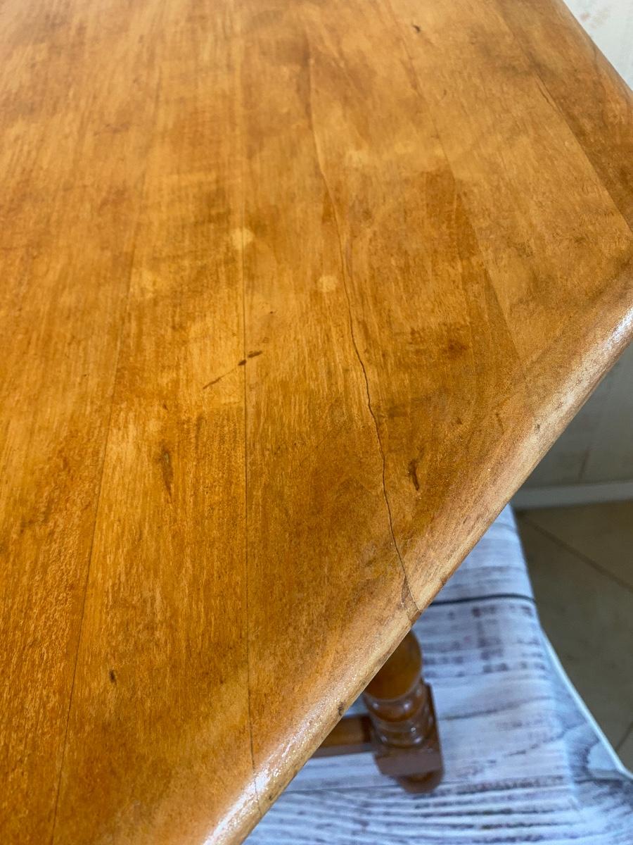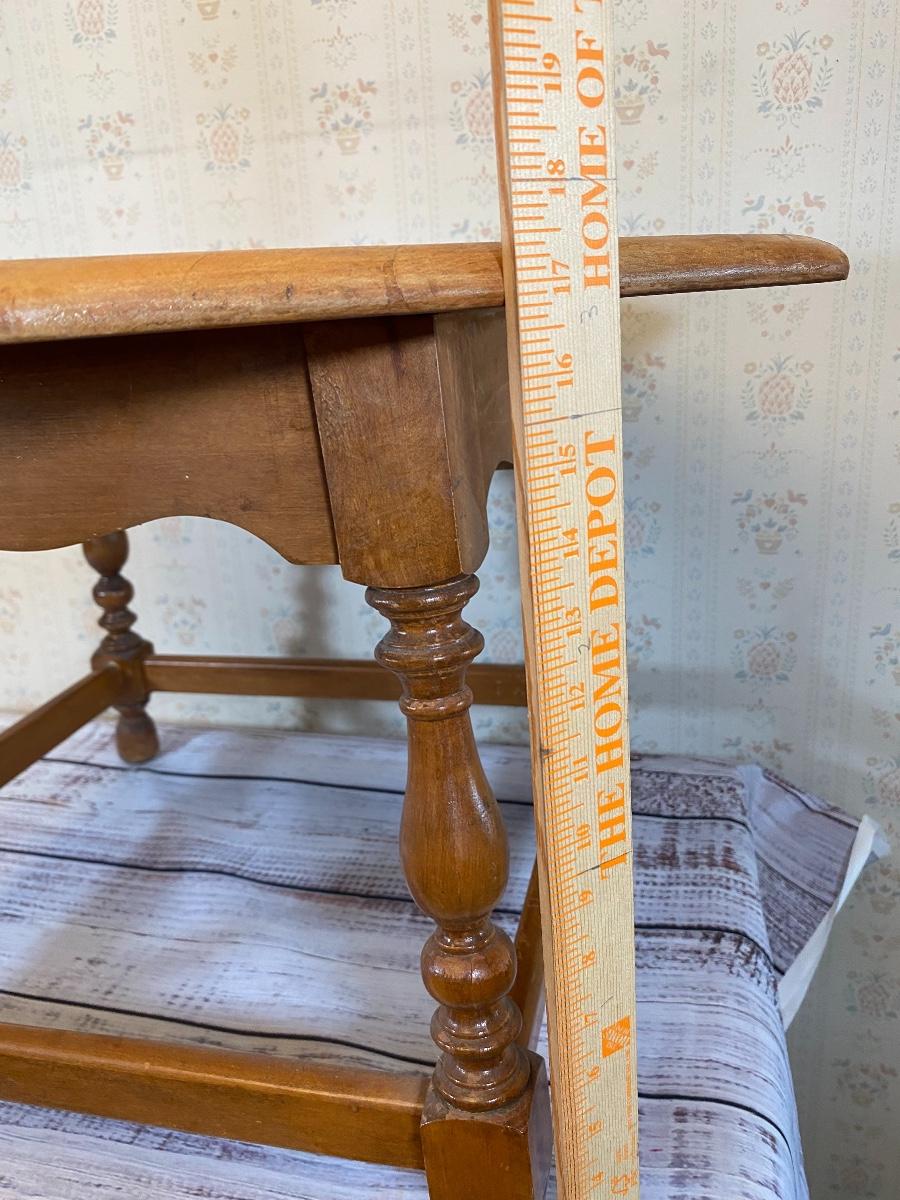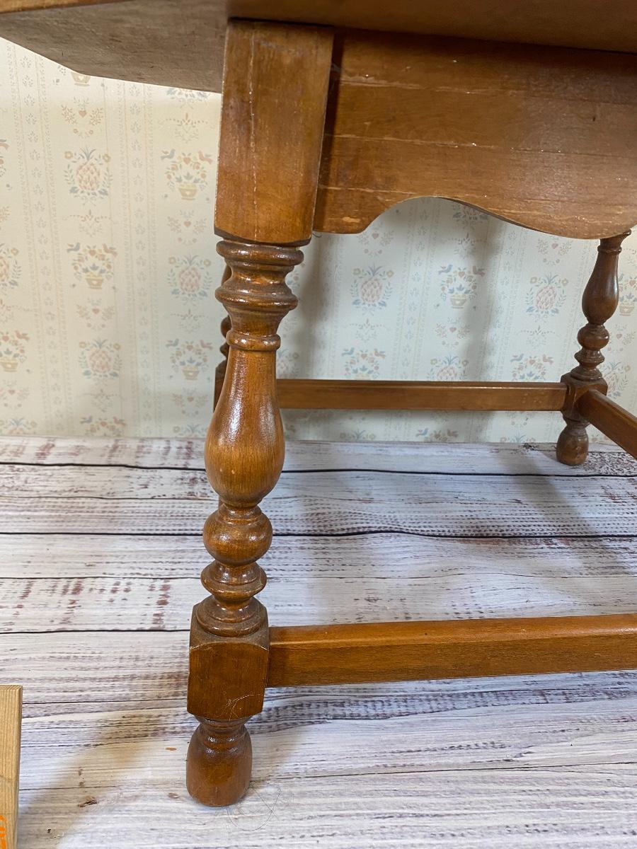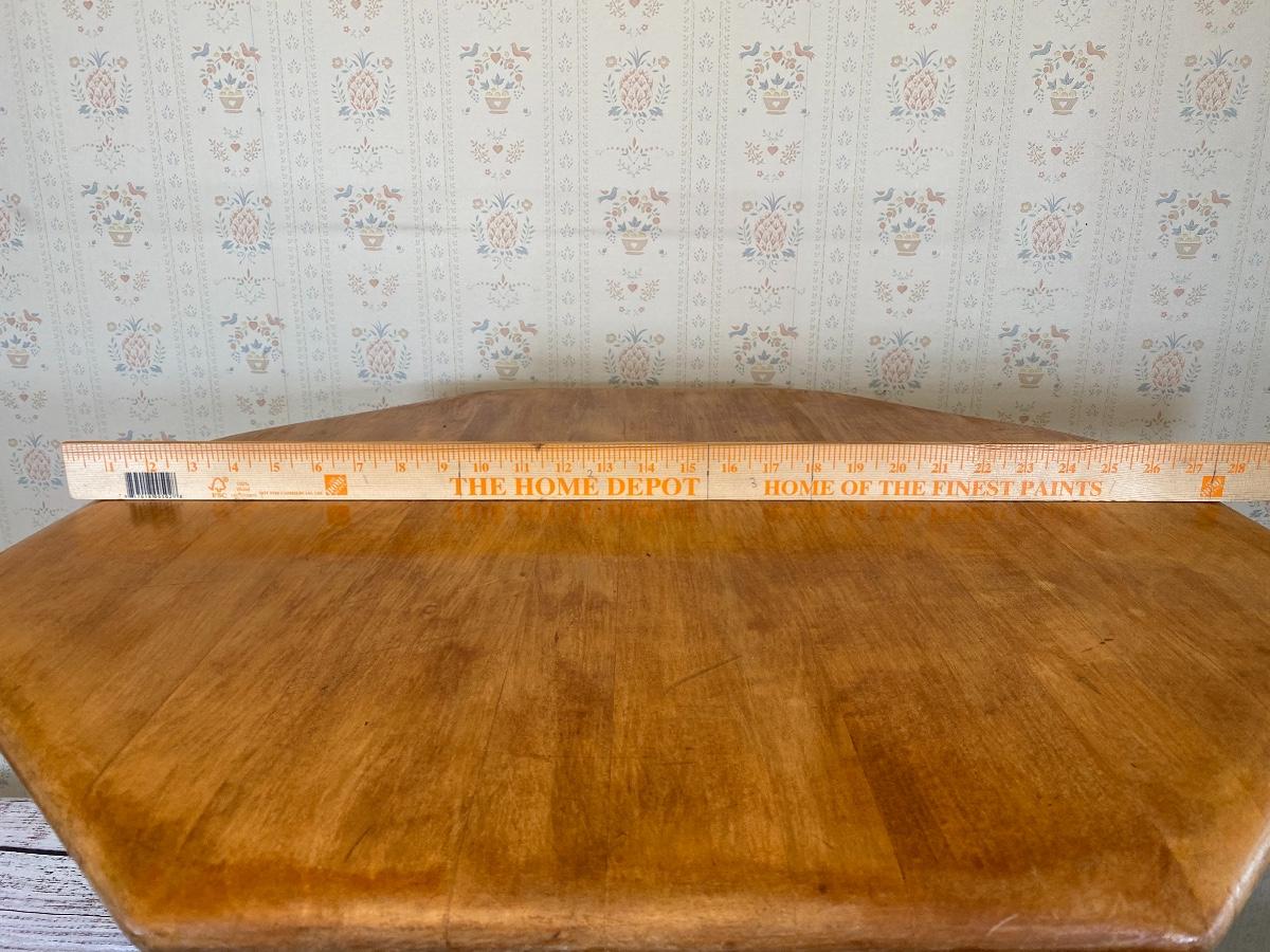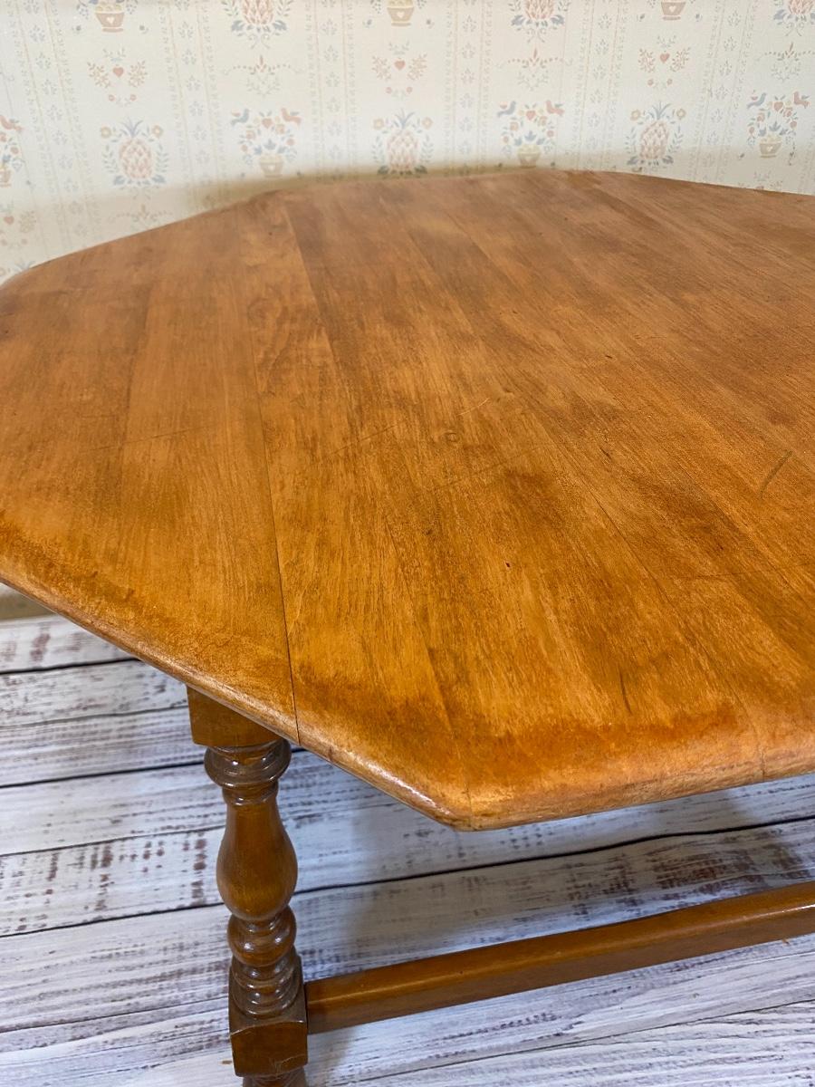 Vintage wood side table. Octagon shape top. Light finish. About 28" across and 17.5" tall. Has been repaired according to the note written underneath. Good used condition.
