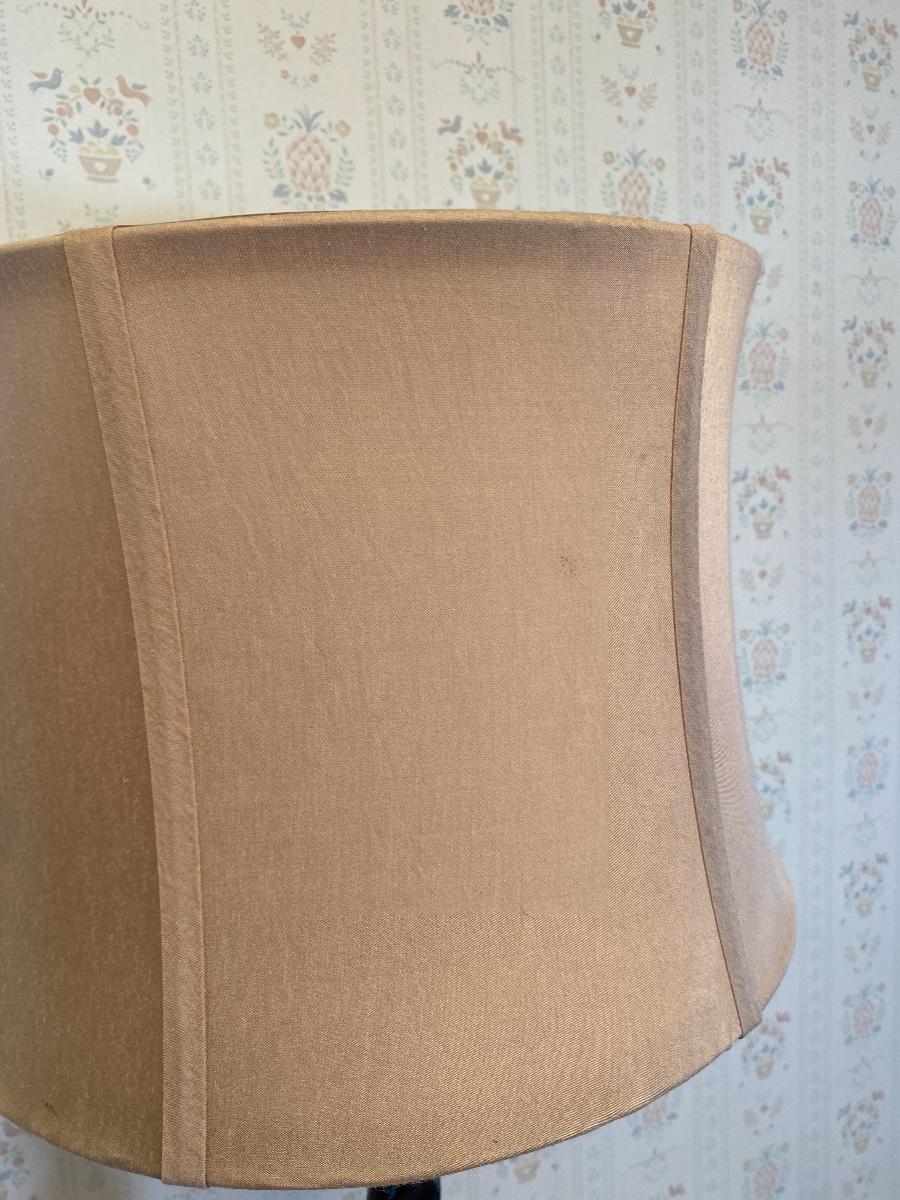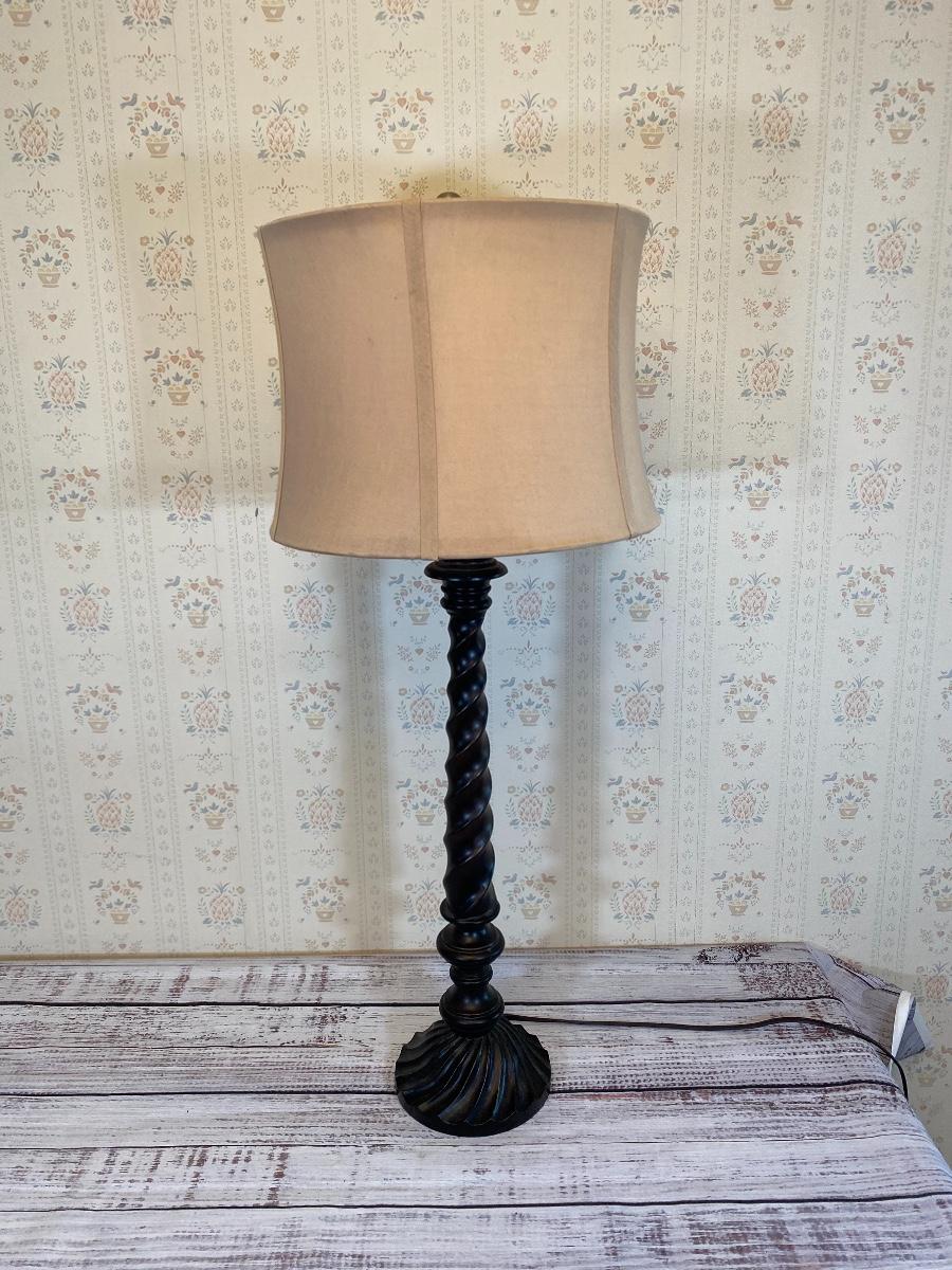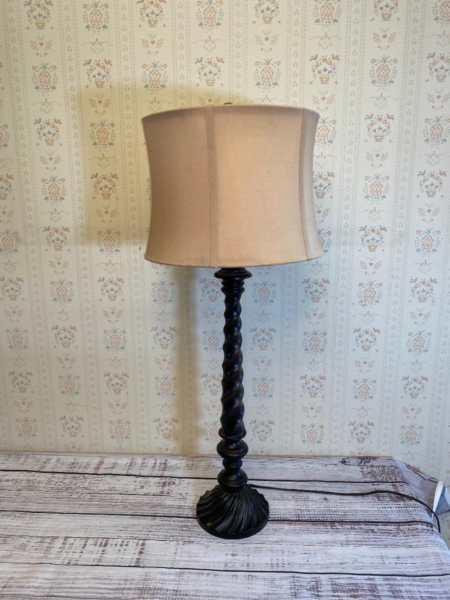 Slender candlestick style table lamp. Tall at almost 34" at top of shade. Shade has some discolor from age & dust.