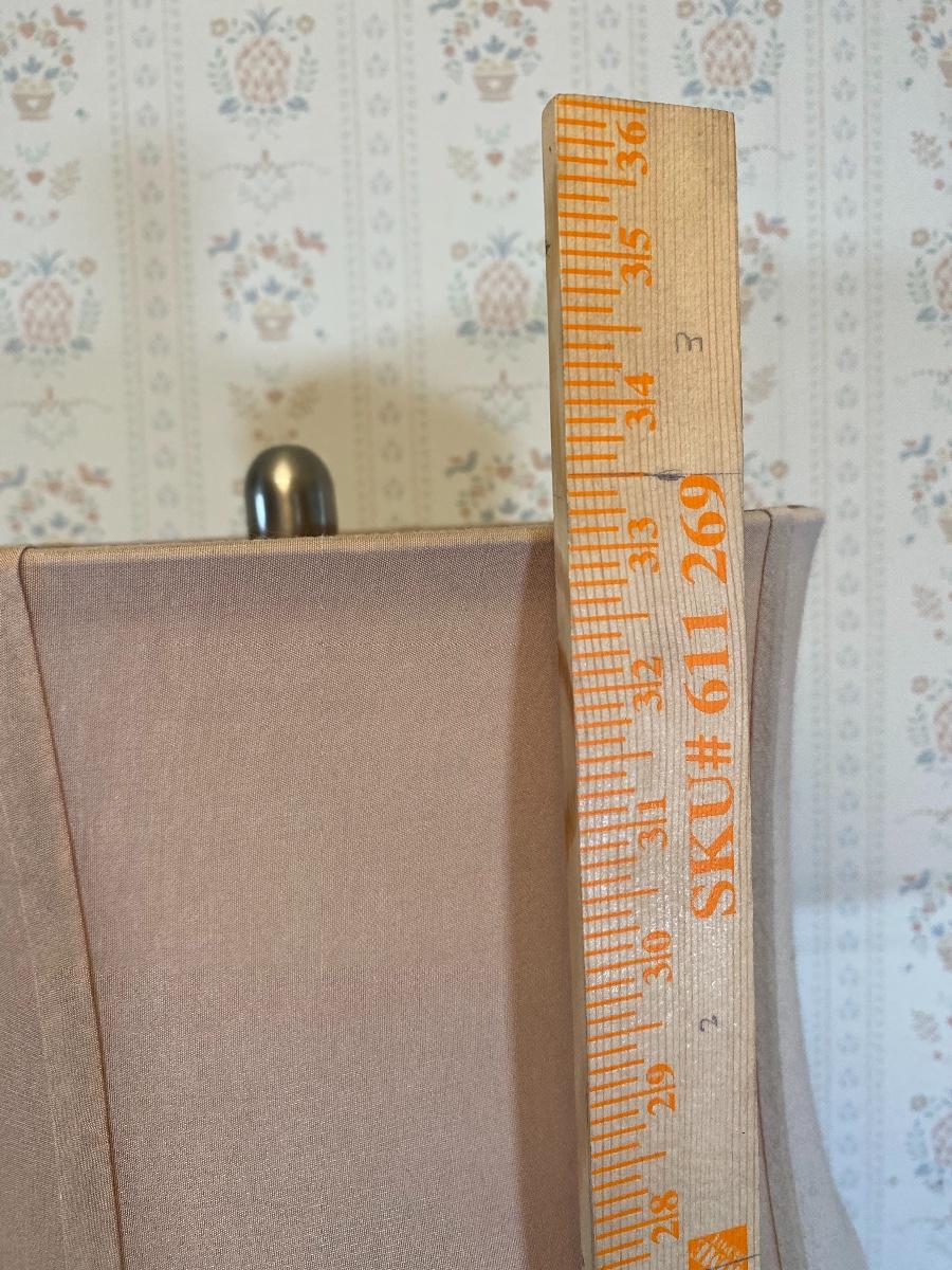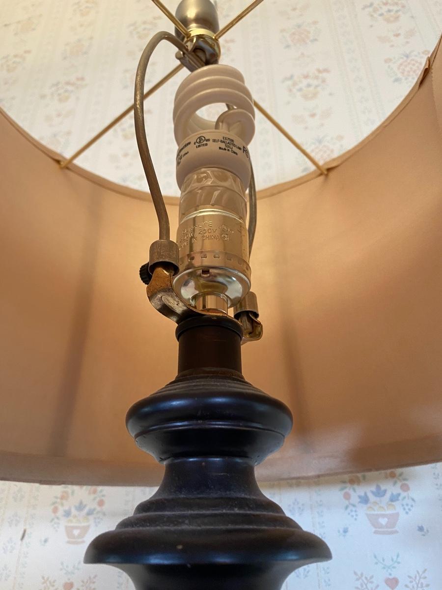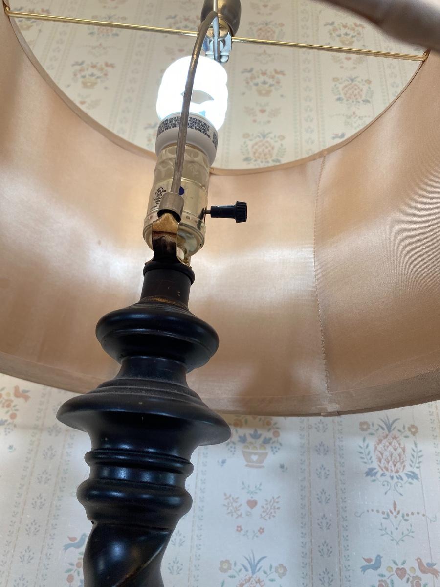 Slender candlestick style table lamp. Tall at almost 34" at top of shade. Shade has some discolor from age & dust.
