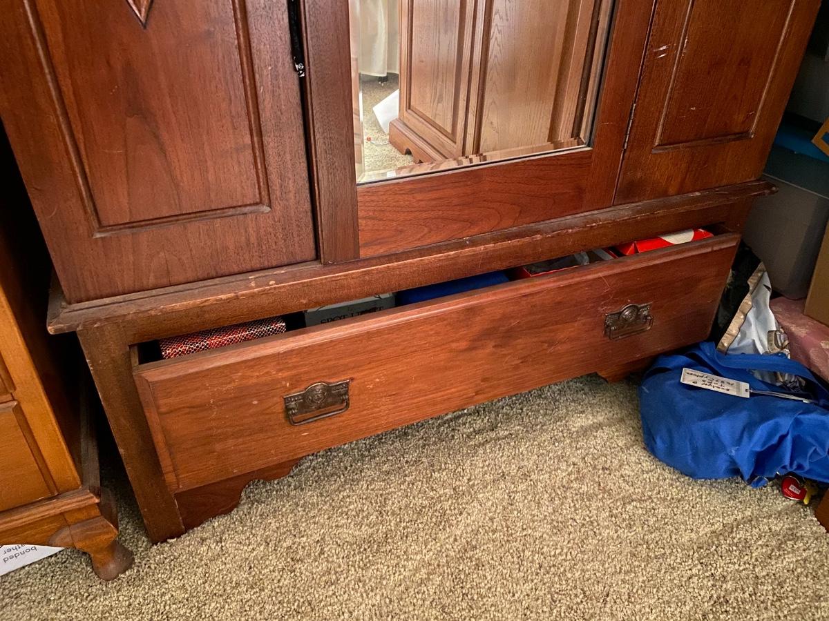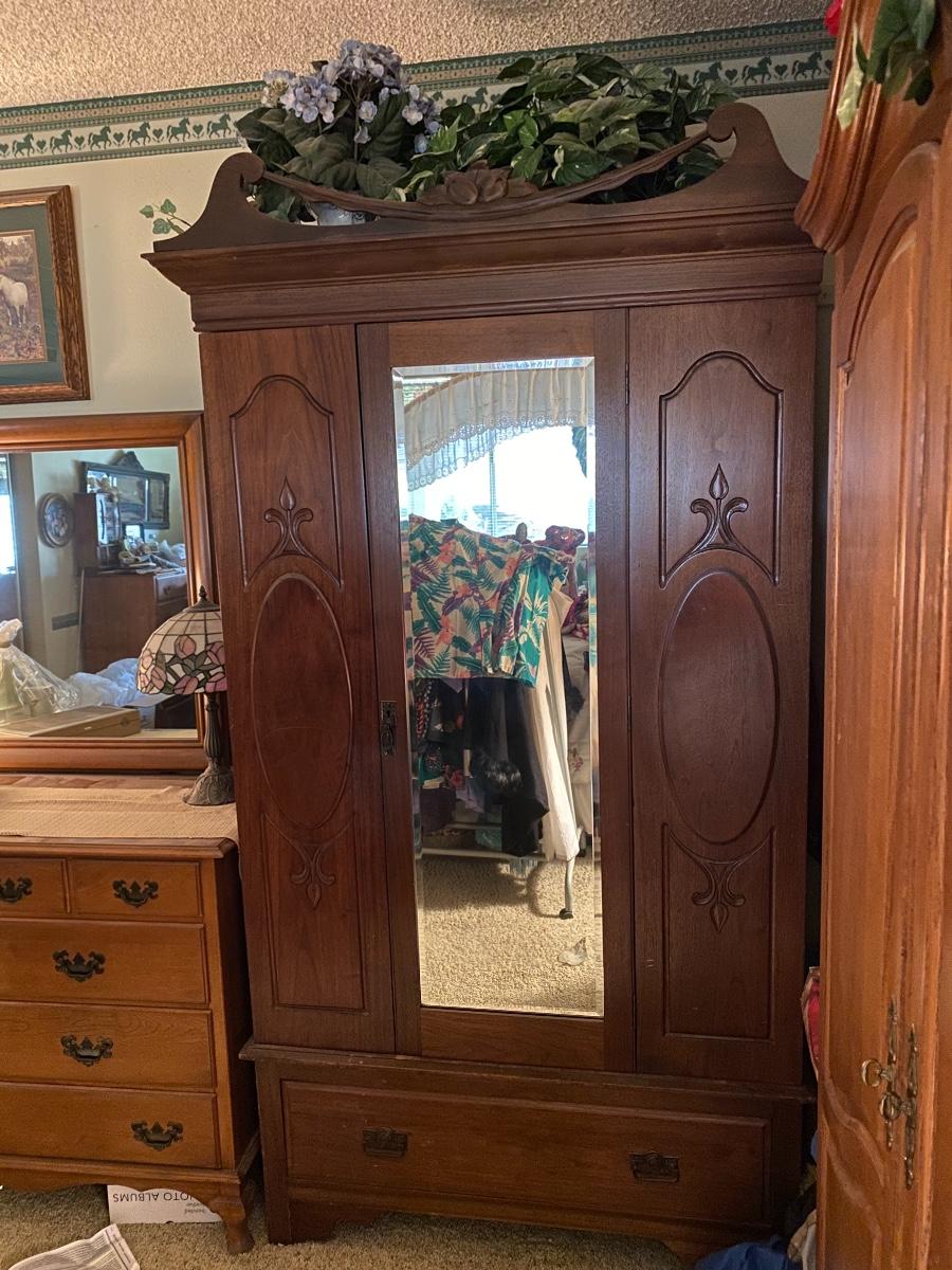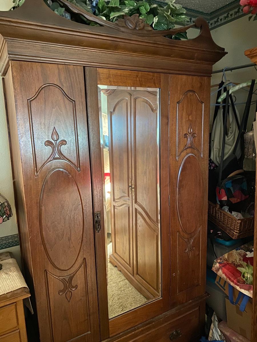 Vintage mirrored armoire. Mirrored door, has two clothes rods inside and a couple hooks. Bottom drawer. Comes apart in three pieces for easy moving. Tall close to 7'.