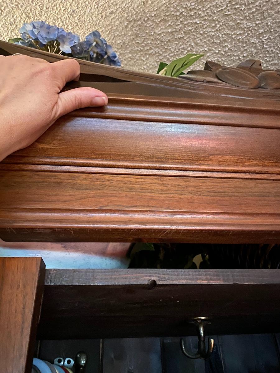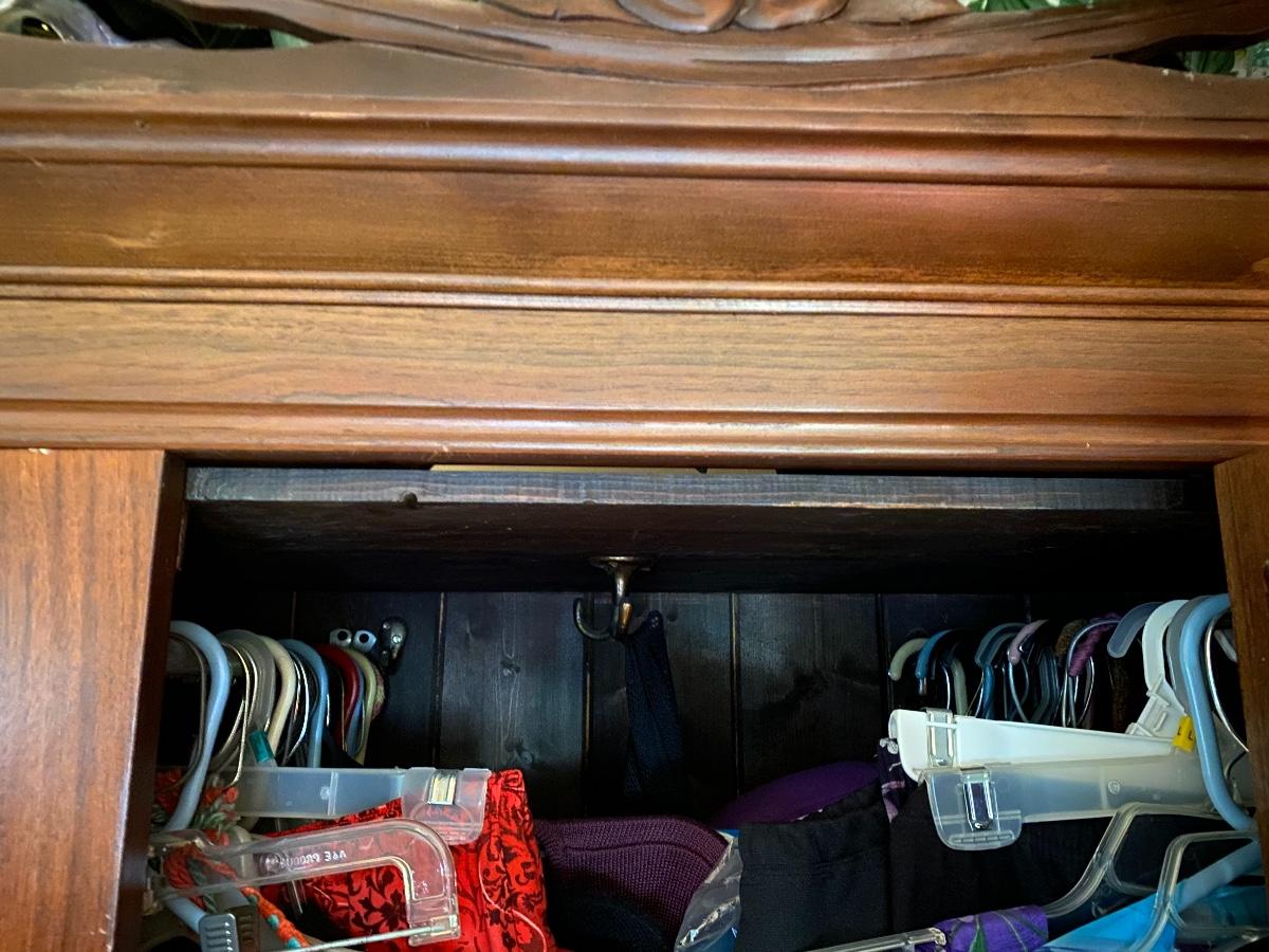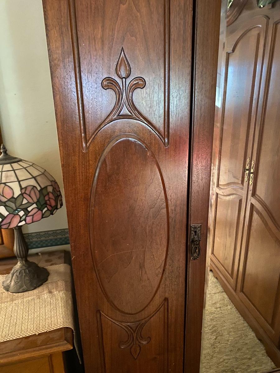 Vintage mirrored armoire. Mirrored door, has two clothes rods inside and a couple hooks. Bottom drawer. Comes apart in three pieces for easy moving. Tall close to 7'.