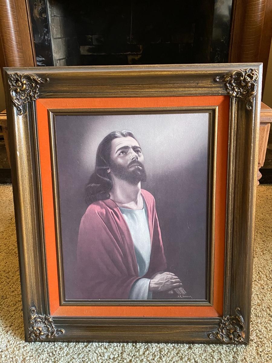 Large vintage Jesus wall art. Nicely framed, may have a little fade but looks nice. About 21x26.